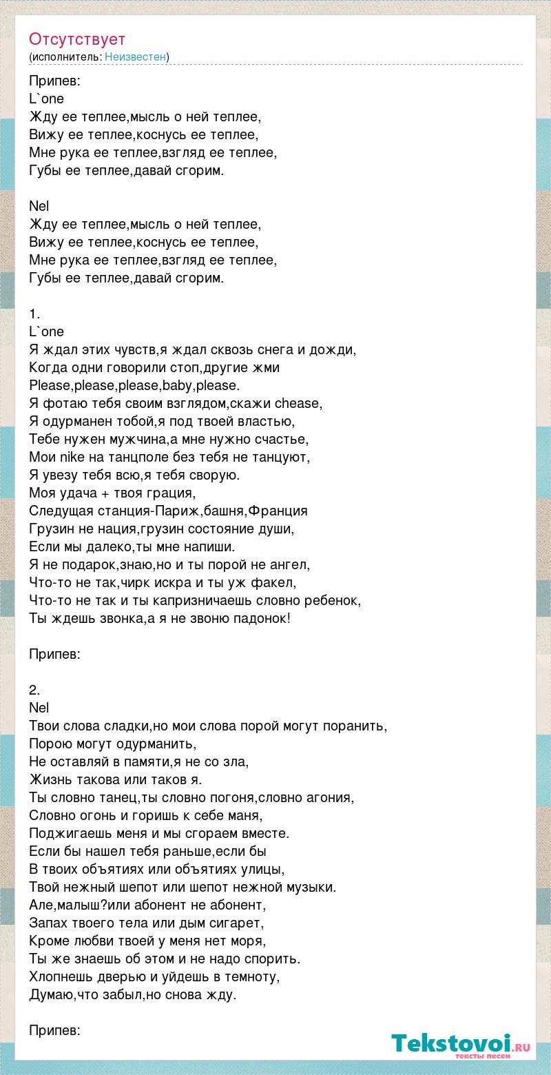 Припев: L`one Жду ее теплее,мысль о ней теплее, Вижу ее теплее,коснусь ее теплее, Мне рука ее теплее,взгляд ее теплее, Губы ее теплее,давай сгорим. Nel Жду ее теплее,мысль о ней теплее, Вижу ее теплее,коснусь ее теплее, Мне рука ее теплее,взгляд ее теплее, Губы ее теплее,давай сгорим. 1. L`one Я ждал этих чувств,я ждал сквозь снега и дожди, Когда одни говорили стоп,другие жми Please,please,please,baby,please. Я фотаю тебя своим взглядом,скажи chease, Я одурманен тобой,я под твоей властью, Тебе нужен мужчина,а мне нужно счастье, Мои nike на танцполе без тебя не танцуют, Я увезу тебя всю,я тебя сворую. Моя удача + твоя грация, Следущая станция-Париж,башня,Франция Грузин не нация,грузин состояние души, Если мы далеко,ты мне напиши. Я не подарок,знаю,но и ты порой не ангел, Что-то не так,чирк искра и ты уж факел, Что-то не так и ты капризничаешь словно ребенок, Ты ждешь звонка,а я не звоню падонок! Припев: 2. Nel Твои слова сладки,но мои слова порой могут поранить, Порою могут одурманить, Не оставляй в памяти,я не со зла, Жизнь такова или таков я. Ты словно танец,ты словно погоня,словно агония, Словно огонь и горишь к себе маня, Поджигаешь меня и мы сгораем вместе. Если бы нашел тебя раньше,если бы В твоих объятиях или объятиях улицы, Твой нежный шепот или шепот нежной музыки. Але,малыш?или абонент не абонент, Запах твоего тела или дым сигарет, Кроме любви твоей у меня нет моря, Ты же знаешь об этом и не надо спорить. Хлопнешь дверью и уйдешь в темноту, Думаю,что забыл,но снова жду. Припев: