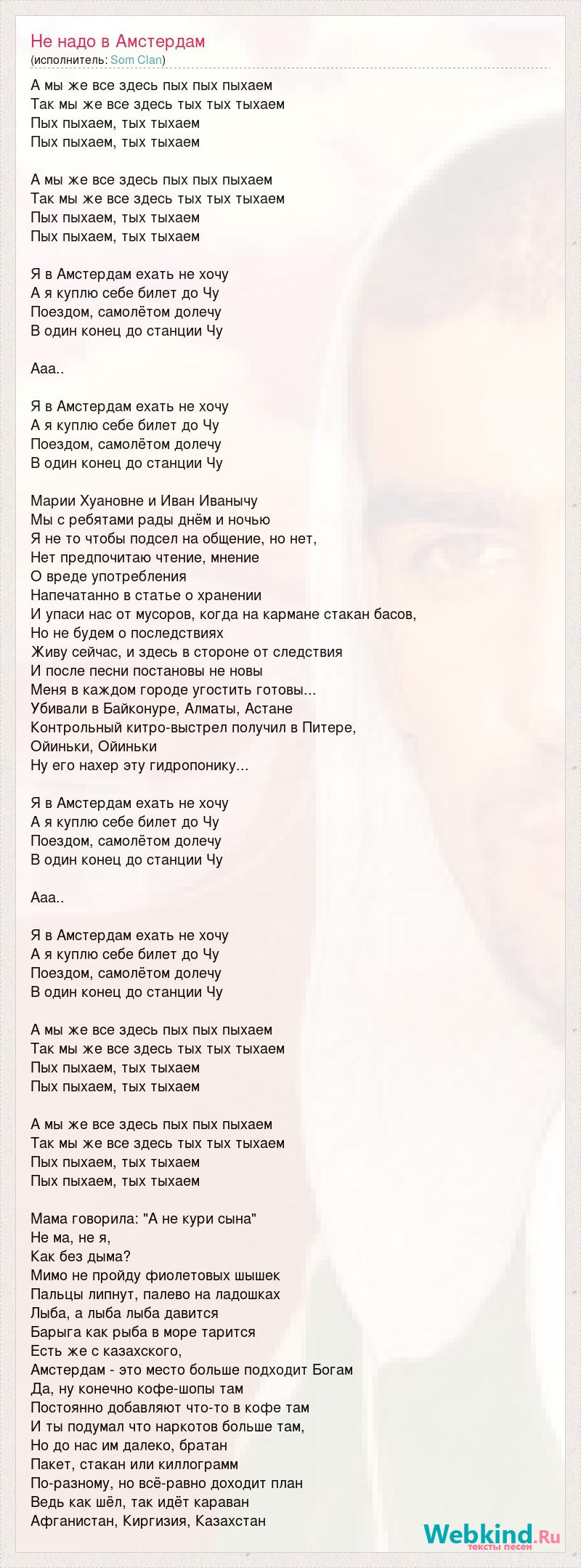 А мы же все здесь пых пых пыхаем Так мы же все здесь тых тых тыхаем Пых пыхаем, тых тыхаем Пых пыхаем, тых тыхаем А мы же все здесь пых пых пыхаем Так мы же все здесь тых тых тыхаем Пых пыхаем, тых тыхаем Пых пыхаем, тых тыхаем Я в Амстердам ехать не хочу А я куплю себе билет до Чу Поездом, самолётом долечу В один конец до станции Чу Ааа.. Я в Амстердам ехать не хочу А я куплю себе билет до Чу Поездом, самолётом долечу В один конец до станции Чу Марии Хуановне и Иван Иванычу Мы с ребятами рады днём и ночью Я не то чтобы подсел на общение, но нет, Нет предпочитаю чтение, мнение О вреде употребления Напечатанно в статье о хранении И упаси нас от мусоров, когда на кармане стакан басов, Но не будем о последствиях Живу сейчас, и здесь в стороне от следствия И после песни постановы не новы Меня в каждом городе угостить готовы... Убивали в Байконуре, Алматы, Астане Контрольный китро-выстрел получил в Питере, Ойиньки, Ойиньки Ну его нахер эту гидропонику... Я в Амстердам ехать не хочу А я куплю себе билет до Чу Поездом, самолётом долечу В один конец до станции Чу Ааа.. Я в Амстердам ехать не хочу А я куплю себе билет до Чу Поездом, самолётом долечу В один конец до станции Чу А мы же все здесь пых пых пыхаем Так мы же все здесь тых тых тыхаем Пых пыхаем, тых тыхаем Пых пыхаем, тых тыхаем А мы же все здесь пых пых пыхаем Так мы же все здесь тых тых тыхаем Пых пыхаем, тых тыхаем Пых пыхаем, тых тыхаем Мама говорила: "А не кури сына" Не ма, не я, Как без дыма? Мимо не пройду фиолетовых шышек Пальцы липнут, палево на ладошках Лыба, а лыба лыба давится Барыга как рыба в море тарится Есть же с казахского, Амстердам - это место больше подходит Богам Да, ну конечно кофе-шопы там Постоянно добавляют что-то в кофе там И ты подумал что наркотов больше там, Но до нас им далеко, братан Пакет, стакан или киллограмм По-разному, но всё-равно доходит план Ведь как шёл, так идёт караван Афганистан, Киргизия, Казахстан