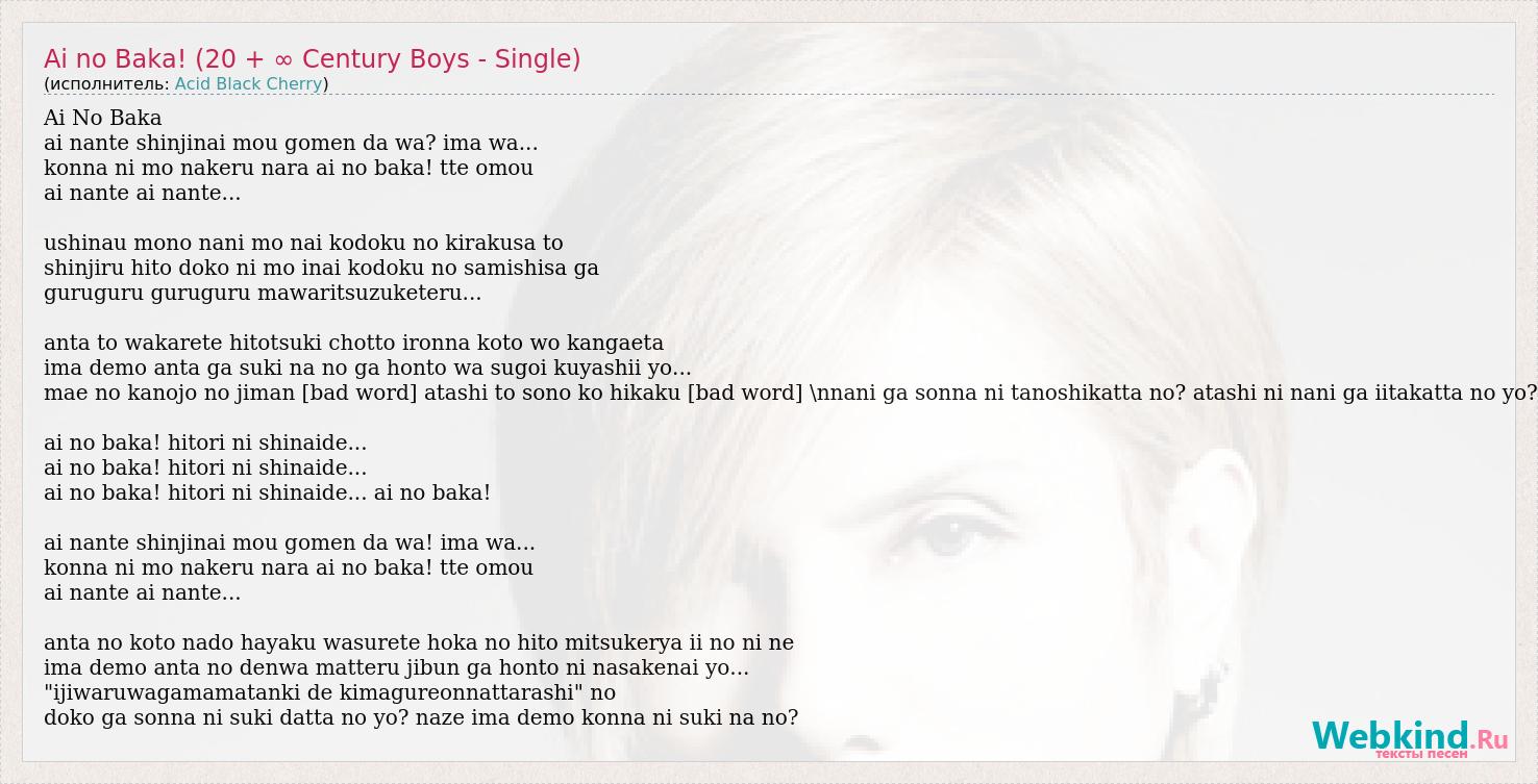 Ai No Baka ai nante shinjinai mou gomen da wa? ima wa... konna ni mo nakeru nara ai no baka! tte omou ai nante ai nante... ushinau mono nani mo nai kodoku no kirakusa to shinjiru hito doko ni mo inai kodoku no samishisa ga guruguru guruguru mawaritsuzuketeru... anta to wakarete hitotsuki chotto ironna koto wo kangaeta ima demo anta ga suki na no ga honto wa sugoi kuyashii yo... mae no kanojo no jiman [bad word] atashi to sono ko hikaku [bad word] \nnani ga sonna ni tanoshikatta no? atashi ni nani ga iitakatta no yo? ai no baka! hitori ni shinaide... ai no baka! hitori ni shinaide... ai no baka! hitori ni shinaide... ai no baka! ai nante shinjinai mou gomen da wa! ima wa... konna ni mo nakeru nara ai no baka! tte omou ai nante ai nante... anta no koto nado hayaku wasurete hoka no hito mitsukerya ii no ni ne ima demo anta no denwa matteru jibun ga honto ni nasakenai yo... "ijiwaru・wagamama・tanki de kimagure・onnattarashi" no doko ga sonna ni suki datta no yo? naze ima demo konna ni suki na no?