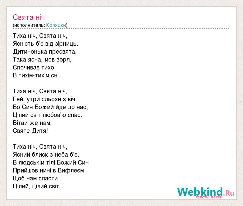 Тиха ніч, Свята ніч, Ясність б’є від зірниць. Дитинонька пресвята, Така ясна, мов зоря, Спочиває тихо В тихім-тихім сні. Тиха ніч, Свята ніч, Гей, утри сльози з віч, Бо Син Божий йде до нас, Цілий світ любов’ю спас. Вітай же нам, Святе Дитя! Тиха ніч, Свята ніч, Ясний блиск з неба б’є. В людськім тілі Божий Син Прийшов нині в Вифлеєм Щоб нам спасти Цілий, цілий світ.