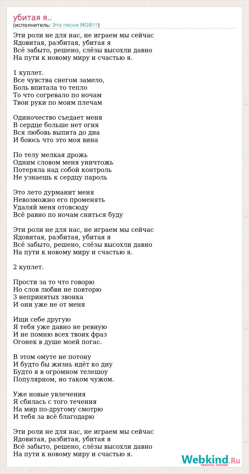 Эти роли не для нас, не играем мы сейчас Ядовитая, разбитая, убитая я Всё забыто, решено, слёзы высохли давно На пути к новому миру и счастью я. 1 куплет. Все чувства снегом замело, Боль впитала то тепло То что согревало по ночам Твои руки по моим плечам Одиночество съедает меня В сердце больше нет огня Вся любовь выпита до дна И боюсь что это моя вина По телу мелкая дрожь Одним словом меня уничтожь Потеряла над собой контроль Не узнаешь к сердцу пароль Это лето дурманит меня Невозможно его променять Удаляй меня отовсюду Всё равно по ночам сниться буду Эти роли не для нас, не играем мы сейчас Ядовитая, разбитая, убитая я Всё забыто, решено, слёзы высохли давно На пути к новому миру и счастью я. 2 куплет. Прости за то что говорю Но слов любви не повторю 3 непринятых звонка И они уже не от меня Ищи себе другую Я тебя уже давно не ревную И не помню всех твоих фраз Огонек в душе моей погас. В этом омуте не потону И будто бы жизнь идёт ко дну Будто я в огромном телешоу Популярном, но таком чужом. Уже новые увлечения Я сбилась с того течения На мир по-другому смотрю И тебя за всё благодарю Эти роли не для нас, не играем мы сейчас Ядовитая, разбитая, убитая я Всё забыто, решено, слёзы высохли давно На пути к новому миру и счастью я.