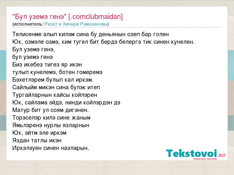 Телисенме алып килэм сина бу деньянын озеп бар голен Юк, озмэле озмэ, ким тугел бит бердэ белергэ тик синен кунелен. Бул уземэ генэ, бул уземэ генэ Биз икебез тигез яр икэн тулып кунелемэ, ботен гомеремэ Бэхетлэрем булып кал иркэм. Сайлыйм микэн сина булэк итеп Тургайларнын кайсы койлэрен Юк, сайлама эйдэ, нинди койлэрдэн дэ Матур бит ул соям дигэнен. Торэселэр килэ сине жаным Ямьлэренэ нурлы язларнын Юк, эйтм эле иркэм Яздан татлы икэн Иркэлэуен синен назларын.