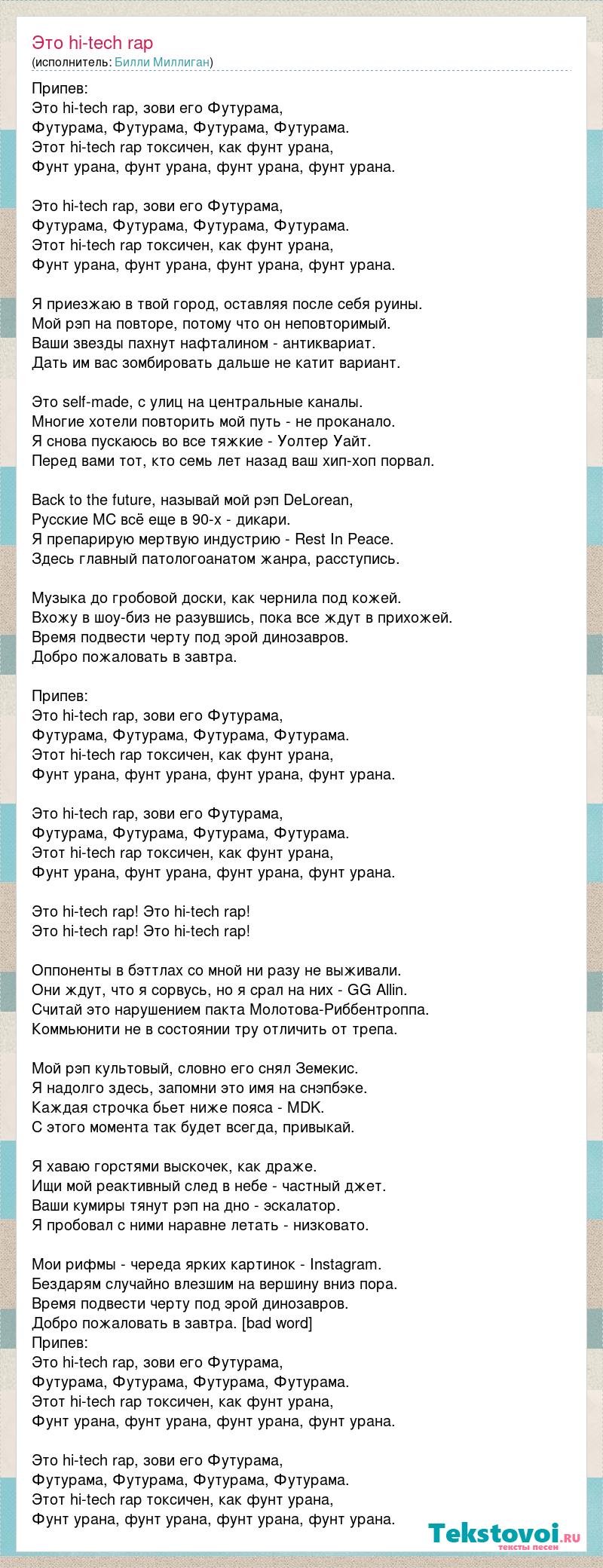Припев: Это hi-tech rap, зови его Футурама, Футурама, Футурама, Футурама, Футурама. Этот hi-tech rap токсичен, как фунт урана, Фунт урана, фунт урана, фунт урана, фунт урана. Это hi-tech rap, зови его Футурама, Футурама, Футурама, Футурама, Футурама. Этот hi-tech rap токсичен, как фунт урана, Фунт урана, фунт урана, фунт урана, фунт урана. Я приезжаю в твой город, оставляя после себя руины. Мой рэп на повторе, потому что он неповторимый. Ваши звезды пахнут нафталином - антиквариат. Дать им вас зомбировать дальше не катит вариант. Это self-made, с улиц на центральные каналы. Многие хотели повторить мой путь - не проканало. Я снова пускаюсь во все тяжкие - Уолтер Уайт. Перед вами тот, кто семь лет назад ваш хип-хоп порвал. Back to the future, называй мой рэп DeLorean, Русские MC всё еще в 90-х - дикари. Я препарирую мертвую индустрию - Rest In Peace. Здесь главный патологоанатом жанра, расступись. Музыка до гробовой доски, как чернила под кожей. Вхожу в шоу-биз не разувшись, пока все ждут в прихожей. Время подвести черту под эрой динозавров. Добро пожаловать в завтра. Припев: Это hi-tech rap, зови его Футурама, Футурама, Футурама, Футурама, Футурама. Этот hi-tech rap токсичен, как фунт урана, Фунт урана, фунт урана, фунт урана, фунт урана. Это hi-tech rap, зови его Футурама, Футурама, Футурама, Футурама, Футурама. Этот hi-tech rap токсичен, как фунт урана, Фунт урана, фунт урана, фунт урана, фунт урана. Это hi-tech rap! Это hi-tech rap! Это hi-tech rap! Это hi-tech rap! Оппоненты в бэттлах со мной ни разу не выживали. Они ждут, что я сорвусь, но я срал на них - GG Allin. Считай это нарушением пакта Молотова-Риббентроппа. Коммьюнити не в состоянии тру отличить от трепа. Мой рэп культовый, словно его снял Земекис. Я надолго здесь, запомни это имя на снэпбэке. Каждая строчка бьет ниже пояса - MDK. С этого момента так будет всегда, привыкай. Я хаваю горстями выскочек, как драже. Ищи мой реактивный след в небе - частный джет. Ваши кумиры тянут рэп на дно - эскалатор. Я пробовал с ними наравне летать - низковато. Мои рифмы - череда ярких картинок - Instagram. Бездарям случайно влезшим на вершину вниз пора. Время подвести черту под эрой динозавров. Добро пожаловать в завтра. [bad word] Припев: Это hi-tech rap, зови его Футурама, Футурама, Футурама, Футурама, Футурама. Этот hi-tech rap токсичен, как фунт урана, Фунт урана, фунт урана, фунт урана, фунт урана. Это hi-tech rap, зови его Футурама, Футурама, Футурама, Футурама, Футурама. Этот hi-tech rap токсичен, как фунт урана, Фунт урана, фунт урана, фунт урана, фунт урана.