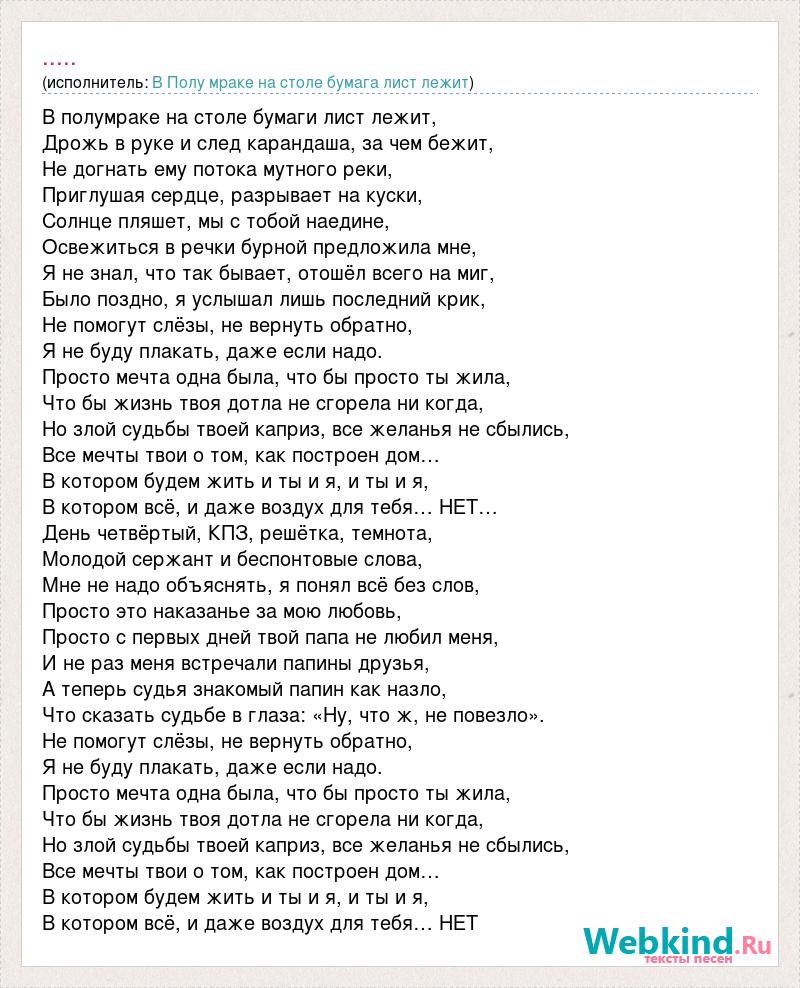 В полумраке на столе бумаги лист лежит, Дрожь в руке и след карандаша, за чем бежит, Не догнать ему потока мутного реки, Приглушая сердце, разрывает на куски, Солнце пляшет, мы с тобой наедине, Освежиться в речки бурной предложила мне, Я не знал, что так бывает, отошёл всего на миг, Было поздно, я услышал лишь последний крик, Не помогут слёзы, не вернуть обратно, Я не буду плакать, даже если надо. Просто мечта одна была, что бы просто ты жила, Что бы жизнь твоя дотла не сгорела ни когда, Но злой судьбы твоей каприз, все желанья не сбылись, Все мечты твои о том, как построен дом… В котором будем жить и ты и я, и ты и я, В котором всё, и даже воздух для тебя… НЕТ… День четвёртый, КПЗ, решётка, темнота, Молодой сержант и беспонтовые слова, Мне не надо объяснять, я понял всё без слов, Просто это наказанье за мою любовь, Просто с первых дней твой папа не любил меня, И не раз меня встречали папины друзья, А теперь судья знакомый папин как назло, Что сказать судьбе в глаза: «Ну, что ж, не повезло». Не помогут слёзы, не вернуть обратно, Я не буду плакать, даже если надо. Просто мечта одна была, что бы просто ты жила, Что бы жизнь твоя дотла не сгорела ни когда, Но злой судьбы твоей каприз, все желанья не сбылись, Все мечты твои о том, как построен дом… В котором будем жить и ты и я, и ты и я, В котором всё, и даже воздух для тебя… НЕТ