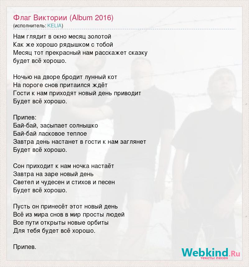 Нам глядит в окно месяц золотой Как же хорошо рядышком с тобой Месяц тот прекрасный нам расскажет сказку будет всё хорошо. Ночью на дворе бродит лунный кот На пороге снов притаился ждёт Гости к нам приходят новый день приводит Будет всё хорошо. Припев: Бай-бай, засыпает солнышко Бай-бай ласковое теплое Завтра день настанет в гости к нам заглянет Будет всё хорошо. Сон приходит к нам ночка настаёт Завтра на заре новый день Светел и чудесен и стихов и песен Будет всё хорошо. Пусть он принесёт этот новый день Всё из мира снов в мир просты людей Все пути открыты новые орбиты Для тебя будет всё хорошо. Припев.