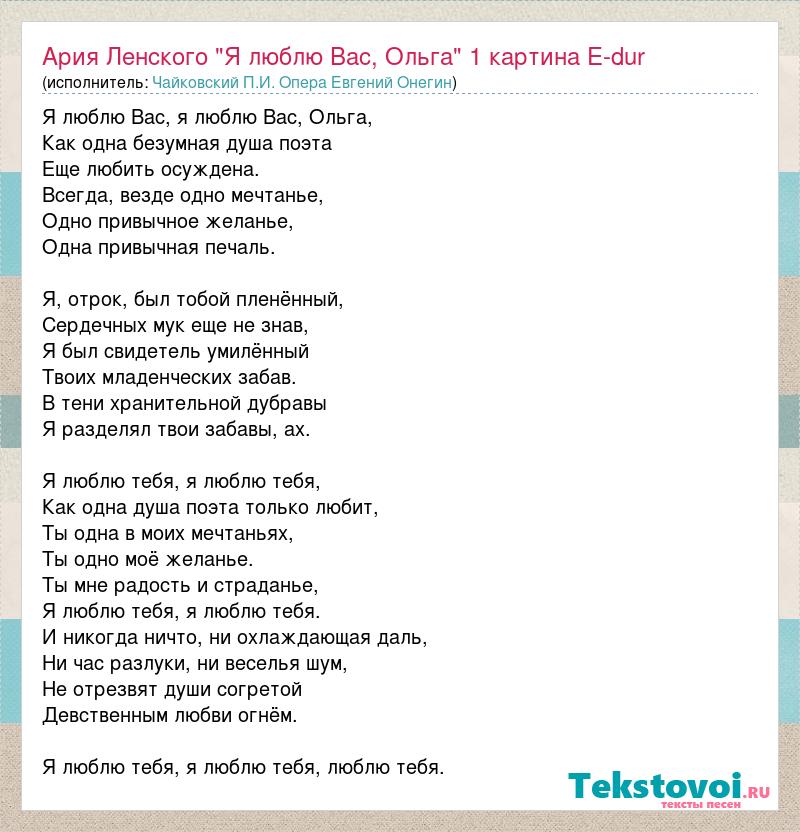 Я люблю Вас, я люблю Вас, Ольга, Как одна безумная душа поэта Еще любить осуждена. Всегда, везде одно мечтанье, Одно привычное желанье, Одна привычная печаль. Я, отрок, был тобой пленённый, Сердечных мук еще не знав, Я был свидетель умилённый Твоих младенческих забав. В тени хранительной дубравы Я разделял твои забавы, ах. Я люблю тебя, я люблю тебя, Как одна душа поэта только любит, Ты одна в моих мечтаньях, Ты одно моё желанье. Ты мне радость и страданье, Я люблю тебя, я люблю тебя. И никогда ничто, ни охлаждающая даль, Ни час разлуки, ни веселья шум, Не отрезвят души согретой Девственным любви огнём. Я люблю тебя, я люблю тебя, люблю тебя.