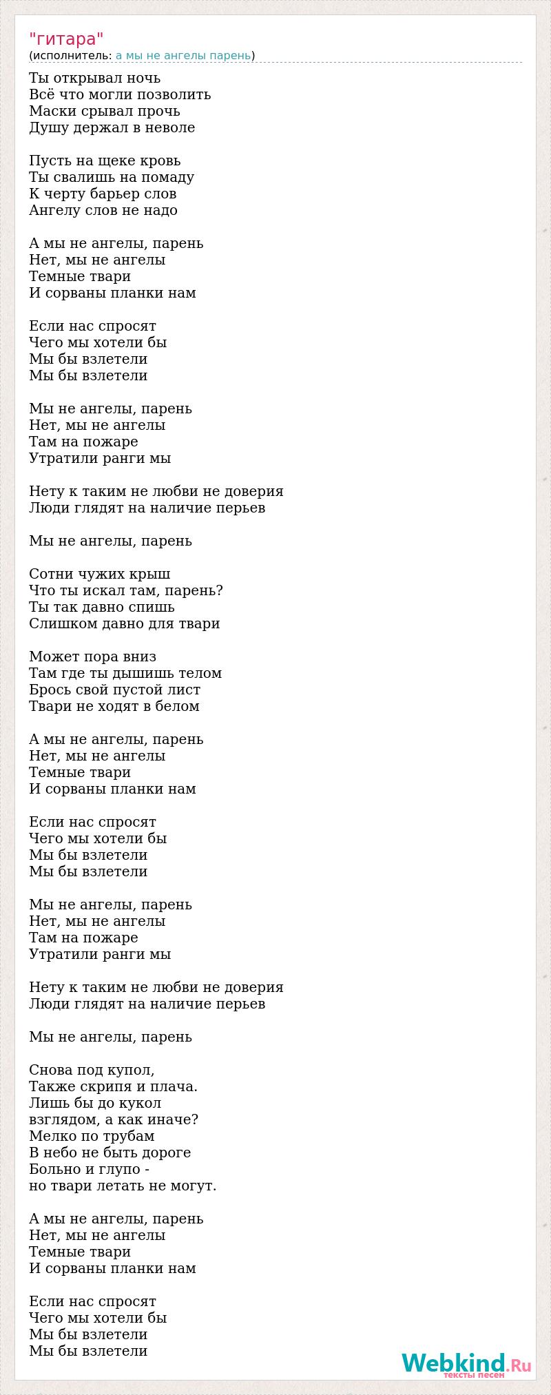 Ты открывал ночь Всё что могли позволить Маски срывал прочь Душу держал в неволе Пусть на щеке кровь Ты свалишь на помаду К черту барьер слов Ангелу слов не надо А мы не ангелы, парень Нет, мы не ангелы Темные твари И сорваны планки нам Если нас спросят Чего мы хотели бы Мы бы взлетели Мы бы взлетели Мы не ангелы, парень Нет, мы не ангелы Там на пожаре Утратили ранги мы Нету к таким не любви не доверия Люди глядят на наличие перьев Мы не ангелы, парень Сотни чужих крыш Что ты искал там, парень? Ты так давно спишь Слишком давно для твари Может пора вниз Там где ты дышишь телом Брось свой пустой лист Твари не ходят в белом А мы не ангелы, парень Нет, мы не ангелы Темные твари И сорваны планки нам Если нас спросят Чего мы хотели бы Мы бы взлетели Мы бы взлетели Мы не ангелы, парень Нет, мы не ангелы Там на пожаре Утратили ранги мы Нету к таким не любви не доверия Люди глядят на наличие перьев Мы не ангелы, парень Снова под купол, Также скрипя и плача. Лишь бы до кукол взглядом, а как иначе? Мелко по трубам В небо не быть дороге Больно и глупо - но твари летать не могут. А мы не ангелы, парень Нет, мы не ангелы Темные твари И сорваны планки нам Если нас спросят Чего мы хотели бы Мы бы взлетели Мы бы взлетели