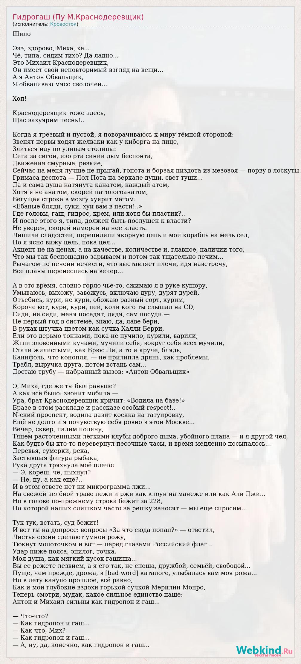 Шило Эээ, здорово, Миха, хе... Чё, типа, сидим тихо? Да ладно... Это Михаил Краснодеревщик, Он имеет свой неповторимый взгляд на вещи... А я Антон Обвальщик, Я обваливаю мясо сволочей... Хоп! Краснодеревщик тоже здесь, Щас захуярим песнь!.. Когда я трезвый и пустой, я поворачиваюсь к миру тёмной стороной: Звенят нервы ходят желваки как у киборга на лице, Злиться иду по улицам столицы: Сига за сигой, изо рта синий дым беспонта, Движения смурные, резкие, Сейчас на меня лучше не прыгай, гопота и борзая пиздота из мезозоя — порву в лоскуты. Гримаса деспота — Пол Пота на зеркале души, свет туши... Да и сама душа натянута канатом, каждый атом, Хотя я не анатом, скорей патологоанатом, Бегущая строка в мозгу хуярит матом: «Ёбаные бляди, суки, хуи вам в пасти!..» Где головы, гаш, гидрос, крем, или хотя бы пластик?.. И после этого я, типа, должен быть послушен к власти? Не уверен, скорей намерен на нее класть. Лишили сладостей, перепилили якорную цепь и мой корабль на мель сел, Но я ясно вижу цель, пока цел... Акцент не на ценах, а на качестве, количестве и, главное, наличии того, Что мы так беспощадно зарываем и потом так тщательно лечим... Рычагом по печени нечисти, что выставляет плечи, идя навстречу, Все планы перенеслись на вечер... А в это время, словно горло чье-то, сжимаю я в руке купюру, Умываюсь, выхожу, завожусь, включаю дуру, дурят дурей, Отъебись, кури, не кури, обожаю разный сорт, курим, Короче вот, кури, кури, пей, коли кого ты слышал на CD, Сиди, не сиди, меня посадят, дядя, сам посуди — Не первый год в системе, знаю, да, лаве бери, В руках штучка цветом как сучка Халли Берри, Ели это дерьмо тоннами, пока не пучило, курили, варили, Жгли зловонными кучами, мучили себя, вокруг себя всех мучили, Стали жилистыми, как Брюс Ли, а то и круче, блядь, Канифоль, что конопля, — не прилипла дрянь, как проблемы, Трабл, выручка друга, потом встань сам... Достаю трубу — набранный вызов: «Антон Обвальщик» Э, Миха, где же ты был раньше? А как всё было: звонит мобила — Ура, брат Краснодеревщик кричит: «Водила на базе!» Бразе в этом раскладе и рассказе особый respect!.. N-ский проспект, водила давит косяка на татуировку, Ещё не долго и я почувствую себя ровно в этой Москве... Вечер, сквер, палим поляну, Тянем расточенными лёгкими клубы доброго дыма, убойного плана — и я другой чел, Как будто бы кто-то перевернул песочные часы, и время медленно посыпалось... Деревья, сумерки, река, Застывшая фигура рыбака, Рука друга тряхнула моё плечо: — Э, кореш, чё, пыхнул? — Не, ну, а как ещё?.. И в этом ответе нет ни микрограмма лжи... На свежей зелёной траве лежи и ржи как клоун на манеже или как Али Джи... Но в голове по-прежнему строка бежит за 228, По которой наших слишком часто за решку заносят — мы еще спросим... Тук-тук, встать, суд бежит! И вот ты на допросе: вопросы «За что сюда попал?» — ответил, Листья осени сделают умной рожу, Тюкнут молоточком и вот — перед глазами Российский флаг... Удар ниже пояса, эпилог, точка. Моя душа, как мягкий кусок гашиша... Вы ее режете лезвием, а я его так, не спеша, дружбой, семьёй, свободой... Пуще, чем прежде, дрожа, в [bad word] каталоге, улыбалась вам моя рожа... Но в лету кануло прошлое, всё равно, Как и мои глубокие вздохи горькой сучкой Мерилин Монро, Теперь смотри, мудак, какое сильное единство наше: Антон и Михаил сильны как гидропон и гаш... — Что-что? — Как гидропон и гаш... — Как что, Мих? — Как гидропон и гаш... —