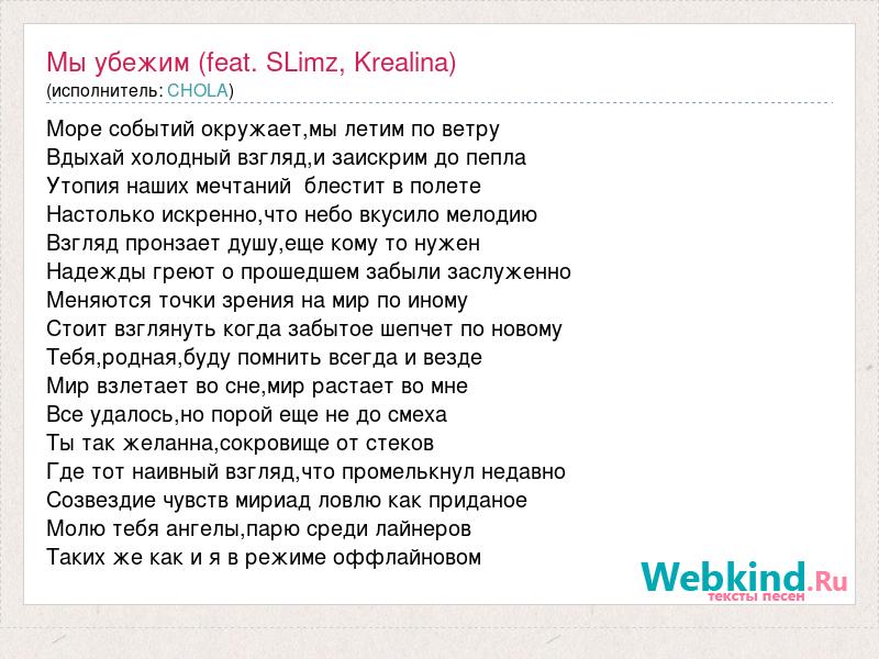 Море событий окружает,мы летим по ветру Вдыхай холодный взгляд,и заискрим до пепла Утопия наших мечтаний блестит в полете Настолько искренно,что небо вкусило мелодию Взгляд пронзает душу,еще кому то нужен Надежды греют о прошедшем забыли заслуженно Меняются точки зрения на мир по иному Стоит взглянуть когда забытое шепчет по новому Тебя,родная,буду помнить всегда и везде Мир взлетает во сне,мир растает во мне Все удалось,но порой еще не до смеха Ты так желанна,сокровище от стеков Где тот наивный взгляд,что промелькнул недавно Созвездие чувств мириад ловлю как приданое Молю тебя ангелы,парю среди лайнеров Таких же как и я в режиме оффлайновом