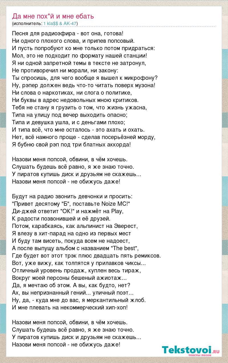Песня для радиоэфира - вот она, готова! Ни одного плохого слова, и припев попсовый. И пусть попробуют ко мне только потом придраться: Мол, это не подходит по формату нашей станции! Я ни одной запретной темы в тексте не затронул, Не противоречил ни морали, ни закону: Ты спросишь, для чего вообще я вышел к микрофону? Ну, рэпер должен ведь что-то читать поверх музона! Ни слова о наркотиках, ни слога о политике, Ни буквы в адрес недовольных мною критиков. Тебя не стану я грузить о том, что жизнь ужасна, Типа на улицу под вечер выходить опасно; Типа и девушка ушла, и с деньгами плохо; И типа всё, что мне осталось - это ахать и охать. Нет, всё намного проще - сделав посерьёзней морду, Я бубню свой рэп под три блатных аккорда! Назови меня попсой, обвини, в чём хочешь. Слушать будешь всё равно, я же знаю точно. У пиратов купишь диск и друзьям не скажешь... Назови меня попсой - не обижусь даже! Будут на радио звонить девчонки и просить: "Привет десятому "Б", поставьте Noize MC!" Ди-джей ответит "ОК!" и нажмёт на Play, К радости позвонившей и её друзей. Потом, карабкаясь, как альпинист на Эверест, Я влезу в хит-парад на одно из первых мест И буду там висеть, покуда всем не надоест, А после выпущу альбом с названием "The best", Где будет вот этот трэк плюс двадцать пять ремиксов. Вот, уже вижу, как толпятся у прилавков чиксы... Отличный уровень продаж, куплен весь тираж, Вокруг моей персоны бешеный ажиотаж... Да, я мечтаю об этом. А вы, как будто, нет? Ах, вы непризнанный гений... уличный поэт... Ну, да, - куда мне до вас, я меркантильный жлоб. И мне плевать на некоммерческий хип-хоп! Назови меня попсой, обвини, в чём хочешь. Слушать будешь всё равно, я же знаю точно. У пиратов купишь диск и друзьям не скажешь... Назови меня попсой - не обижусь даже!
