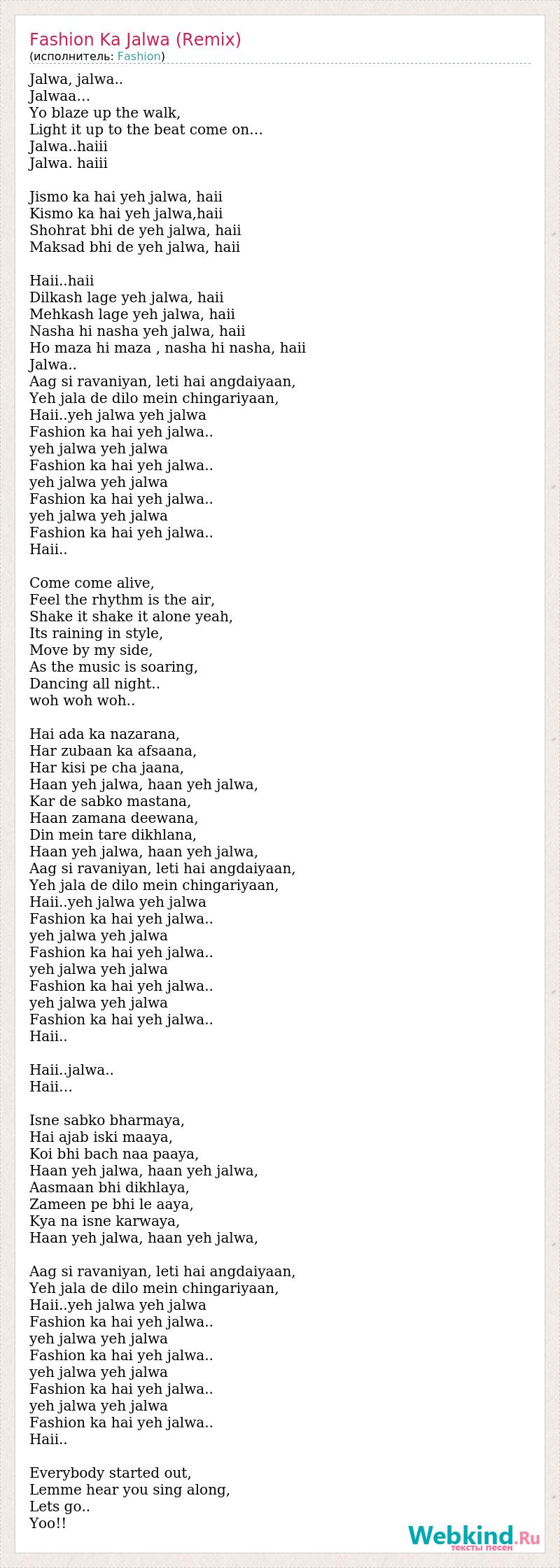 Jalwa, jalwa.. Jalwaa… Yo blaze up the walk, Light it up to the beat come on… Jalwa..haiii Jalwa. haiii Jismo ka hai yeh jalwa, haii Kismo ka hai yeh jalwa,haii Shohrat bhi de yeh jalwa, haii Maksad bhi de yeh jalwa, haii Haii..haii Dilkash lage yeh jalwa, haii Mehkash lage yeh jalwa, haii Nasha hi nasha yeh jalwa, haii Ho maza hi maza , nasha hi nasha, haii Jalwa.. Aag si ravaniyan, leti hai angdaiyaan, Yeh jala de dilo mein chingariyaan, Haii..yeh jalwa yeh jalwa Fashion ka hai yeh jalwa.. yeh jalwa yeh jalwa Fashion ka hai yeh jalwa.. yeh jalwa yeh jalwa Fashion ka hai yeh jalwa.. yeh jalwa yeh jalwa Fashion ka hai yeh jalwa.. Haii.. Come come alive, Feel the rhythm is the air, Shake it shake it alone yeah, Its raining in style, Move by my side, As the music is soaring, Dancing all night.. woh woh woh.. Hai ada ka nazarana, Har zubaan ka afsaana, Har kisi pe cha jaana, Haan yeh jalwa, haan yeh jalwa, Kar de sabko mastana, Haan zamana deewana, Din mein tare dikhlana, Haan yeh jalwa, haan yeh jalwa, Aag si ravaniyan, leti hai angdaiyaan, Yeh jala de dilo mein chingariyaan, Haii..yeh jalwa yeh jalwa Fashion ka hai yeh jalwa.. yeh jalwa yeh jalwa Fashion ka hai yeh jalwa.. yeh jalwa yeh jalwa Fashion ka hai yeh jalwa.. yeh jalwa yeh jalwa Fashion ka hai yeh jalwa.. Haii.. Haii..jalwa.. Haii… Isne sabko bharmaya, Hai ajab iski maaya, Koi bhi bach naa paaya, Haan yeh jalwa, haan yeh jalwa, Aasmaan bhi dikhlaya, Zameen pe bhi le aaya, Kya na isne karwaya, Haan yeh jalwa, haan yeh jalwa, Aag si ravaniyan, leti hai angdaiyaan, Yeh jala de dilo mein chingariyaan, Haii..yeh jalwa yeh jalwa Fashion ka hai yeh jalwa.. yeh jalwa yeh jalwa Fashion ka hai yeh jalwa.. yeh jalwa yeh jalwa Fashion ka hai yeh jalwa.. yeh jalwa yeh jalwa Fashion ka hai yeh jalwa.. Haii.. Everybody started out, Lemme hear you sing along, Lets go.. Yoo!!