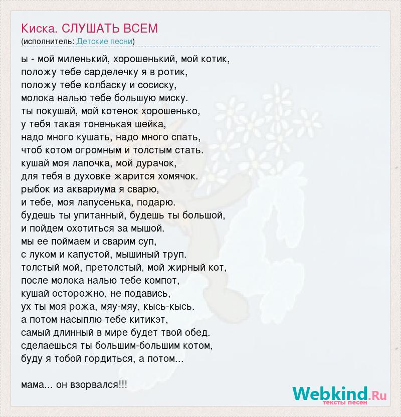 ы - мой миленький, хорошенький, мой котик, положу тебе сарделечку я в ротик, положу тебе колбаску и сосиску, молока налью тебе большую миску. ты покушай, мой котенок хорошенько, у тебя такая тоненькая шейка, надо много кушать, надо много спать, чтоб котом огромным и толстым стать. кушай моя лапочка, мой дурачок, для тебя в духовке жарится хомячок. рыбок из аквариума я сварю, и тебе, моя лапусенька, подарю. будешь ты упитанный, будешь ты большой, и пойдем охотиться за мышой. мы ее поймаем и сварим суп, с луком и капустой, мышиный труп. толстый мой, претолстый, мой жирный кот, после молока налью тебе компот, кушай осторожно, не подавись, ух ты моя рожа, мяу-мяу, кысь-кысь. а потом насыплю тебе китикэт, самый длинный в мире будет твой обед. сделаешься ты большим-большим котом, буду я тобой гордиться, а потом... мама... он взорвался!!!