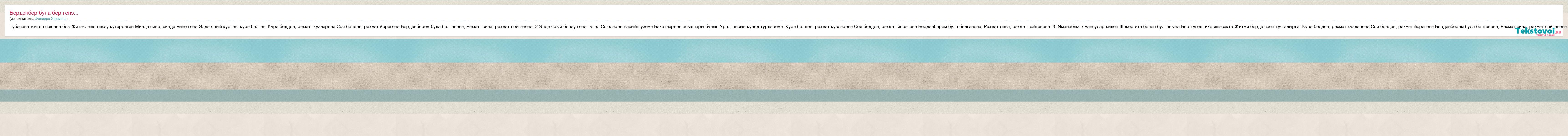 Тубэсенэ житеп союнен без Житэклэшеп икэу кутэрелгэн Миндэ сине, синдэ мине генэ Элдэ ярый кургэн, курэ белгэн. Курэ белден, рэхмэт кузлэренэ Соя белден, рэхмэт йорэгенэ Бердэнберем була белгэненэ, Рэхмэт сина, рэхмэт сойгэненэ. 2.Элдэ ярый берэу генэ тугел Союлэрен насыйп уземэ Бэхетлэрнен асыллары булып Уралгансын кунел турлэремэ. Курэ белден, рэхмэт кузлэренэ Соя белден, рэхмэт йорэгенэ Бердэнберем була белгэненэ, Рэхмэт сина, рэхмэт сойгэненэ. 3. Яманабыз, ямансулар килеп Шокер итэ белеп булганына Бер тугел, ике яшэсэктэ Житми бердэ соеп туя алырга. Курэ белден, рэхмэт кузлэренэ Соя белден, рэхмэт йорэгенэ Бердэнберем була белгэненэ, Рэхмэт сина, рэхмэт сойгэненэ.