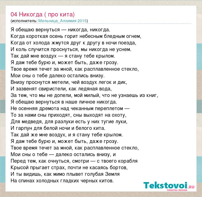 Я обещаю вернуться — никогда, никогда. Когда короткая осень горит небесным бледным огнем, Когда от холода жмутся друг к другу в ночи поезда, И коль случится проснуться, мы никогда не уснем. Так дай мне воздух — я стану тебе крылом. Я дам тебе бурю и, может быть, даже грозу. Твое время течет за мной, как расплавленное стекло, Мои сны о тебе далеко остались внизу. Внизу проснутся метели, чей воздух легок и дик, И зазвенят свиристели, как ледяная вода, За тем, что мы не допели, мой милый, что не узнаешь из книг, Я обещаю вернуться в наше личное никогда. Не осенняя дремота над чеканным переплетом — То за нами сны приходят, сны выходят на охоту, Для медведя, для разлуки есть у них тугие луки, И гарпун для белой ночи и белого кита. Так дай же мне воздух, и я стану тебе крылом. Я дам тебе бурю и, может быть, даже грозу. Твое время течет за мной, как расплавленное стекло, Мои сны о тебе — далеко остались внизу, и Перед тем, как очнуться, смотри — с твоего корабля Крысой прыгает страх, почти не касаясь бортов, И ты видишь, как мимо плывет голубая Земля На спинах холодных гладких черных китов.
