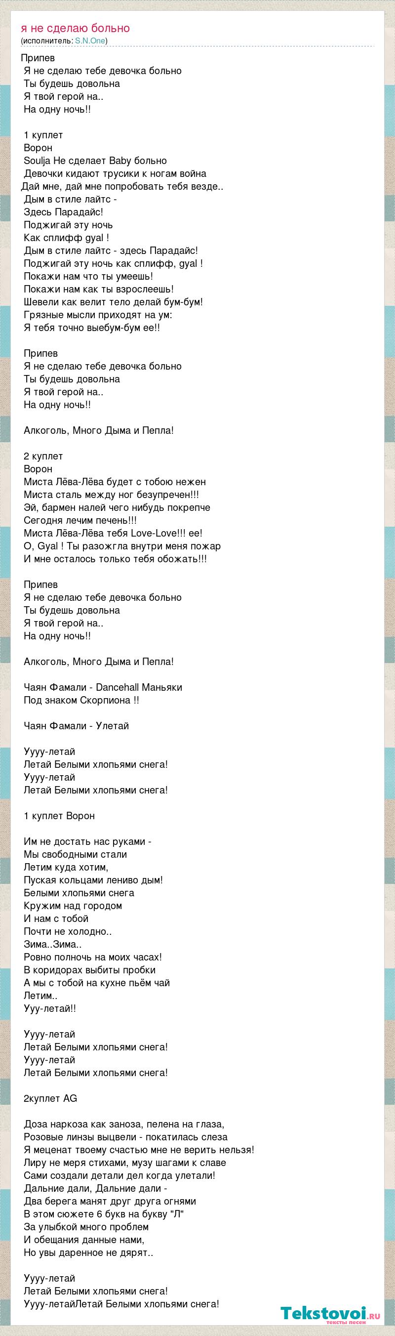 Припев Я не сделаю тебе девочка больно Ты будешь довольна Я твой герой на.. На одну ночь!! 1 куплет Ворон Soulja Не сделает Baby больно Девочки кидают трусики к ногам война Дай мне, дай мне попробовать тебя везде.. Дым в стиле лайтс - Здесь Парадайс! Поджигай эту ночь Как сплифф gyal ! Дым в стиле лайтс - здесь Парадайс! Поджигай эту ночь как сплифф, gyal ! Покажи нам что ты умеешь! Покажи нам как ты взрослеешь! Шевели как велит тело делай бум-бум! Грязные мысли приходят на ум: Я тебя точно выебум-бум ее!! Припев Я не сделаю тебе девочка больно Ты будешь довольна Я твой герой на.. На одну ночь!! Алкоголь, Много Дыма и Пепла! 2 куплет Ворон Миста Лёва-Лёва будет с тобою нежен Миста сталь между ног безупречен!!! Эй, бармен налей чего нибудь покрепче Сегодня лечим печень!!! Миста Лёва-Лёва тебя Love-Love!!! ее! O, Gyal ! Ты разожгла внутри меня пожар И мне осталось только тебя обожать!!! Припев Я не сделаю тебе девочка больно Ты будешь довольна Я твой герой на.. На одну ночь!! Алкоголь, Много Дыма и Пепла! Чаян Фамали - Dancehall Маньяки Под знаком Скорпиона !! Чаян Фамали - Улетай Уууу-летай Летай Белыми хлопьями снега! Уууу-летай Летай Белыми хлопьями снега! 1 куплет Ворон Им не достать нас руками - Мы свободными стали Летим куда хотим, Пуская кольцами лениво дым! Белыми хлопьями снега Кружим над городом И нам с тобой Почти не холодно.. Зима..Зима.. Ровно полночь на моих часах! В коридорах выбиты пробки А мы с тобой на кухне пьём чай Летим.. Ууу-летай!! Уууу-летай Летай Белыми хлопьями снега! Уууу-летай Летай Белыми хлопьями снега! 2куплет AG Доза наркоза как заноза, пелена на глаза, Розовые линзы выцвели - покатилась слеза Я меценат твоему счастью мне не верить нельзя! Лиру не меря стихами, музу шагами к славе Сами создали детали дел когда улетали! Дальние дали, Дальние дали - Два берега манят друг друга огнями В этом сюжете 6 букв на букву "Л" За улыбкой много проблем И обещания данные нами, Но увы даренное не дярят.. Уууу-летай Летай Белыми хлопьями снега! Уууу-летайЛетай Белыми хлопьями снега!