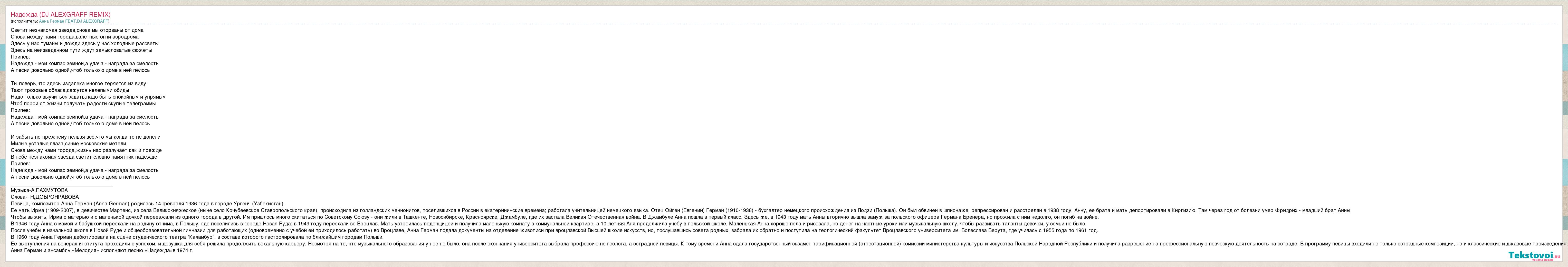 Светит незнакомая звезда,снова мы оторваны от дома Снова между нами города,взлетные огни аэродрома Здесь у нас туманы и дожди,здесь у нас холодные рассветы Здесь на неизведанном пути ждут замысловатые сюжеты Припев: Надежда - мой компас земной,а удача - награда за смелость А песни довольно одной,чтоб только о доме в ней пелось Ты поверь,что здесь издалека многое теряется из виду Тают грозовые облака,кажутся нелепыми обиды Надо только выучиться ждать,надо быть спокойным и упрямым Чтоб порой от жизни получать радости скупые телеграммы Припев: Надежда - мой компас земной,а удача - награда за смелость А песни довольно одной,чтоб только о доме в ней пелось И забыть по-прежнему нельзя всё,что мы когда-то не допели Милые усталые глаза,синие московские метели Снова между нами города,жизнь нас разлучает как и прежде В небе незнакомая звезда светит словно памятник надежде Припев: Надежда - мой компас земной,а удача - награда за смелость А песни довольно одной,чтоб только о доме в ней пелось ____________________________________ Музыка-А.ПАХМУТОВА Слова- Н,ДОБРОНРАВОВА Певица, композитор Анна Герман (Anna German) родилась 14 февраля 1936 года в городе Ургенч (Узбекистан). Ее мать Ирма (1909-2007), в девичестве Мартенс, из села Великокняжеское (ныне село Кочубеевское Ставропольского края), происходила из голландских меннонитов, поселившихся в России в екатерининские времена; работала учительницей немецкого языка. Отец Ойген (Евгений) Герман (1910-1938) - бухгалтер немецкого происхождения из Лодзи (Польша). Он был обвинен в шпионаже, репрессирован и расстрелян в 1938 году. Анну, ее брата и мать депортировали в Киргизию. Там через год от болезни умер Фридрих - младший брат Анны. Чтобы выжить, Ирма с матерью и с маленькой дочкой переезжали из одного города в другой. Им пришлось много скитаться по Советскому Союзу - они жили в Ташкенте, Новосибирске, Красноярске, Джамбуле, где их застала Великая Отечественная война. В Джамбуле Анна пошла в первый класс. Здесь же, в 1943 году мать Анны вторично вышла замуж за польского офицера Германа Бренера, но прожила с ним недолго, он погиб на войне. В 1946 году Анна с мамой и бабушкой переехали на родину отчима, в Польшу, где поселились в городе Новая Руда; в 1949 году переехали во Вроцлав. Мать устроилась поденщицей и получила маленькую комнату в коммунальной квартире, а 10-летняя Аня продолжила учебу в польской школе. Маленькая Анна хорошо пела и рисовала, но денег на частные уроки или музыкальную школу, чтобы развивать таланты девочки, у семьи не было. После учебы в начальной школе в Новой Руде и общеобразовательной гимназии для работающих (одновременно с учебой ей приходилось работать) во Вроцлаве, Анна Герман подала документы на отделение живописи при вроцлавской Высшей школе искусств, но, послушавшись совета родных, забрала их обратно и поступила на геологический факультет Вроцлавского университета им. Болеслава Берута, где училась с 1955 года по 1961 год. В 1960 году Анна Герман дебютировала на сцене студенческого театра "Каламбур", в составе которого гастролировала по ближайшим городам Польши. Ее выступления на вечерах института проходили с успехом, и девушка для себя решила продолжить вокальную карьеру. Несмотря на то, что музыкального образования у нее не было, она после окончания университета выбрала профессию не геолога, а эстрадной певицы. К тому времен