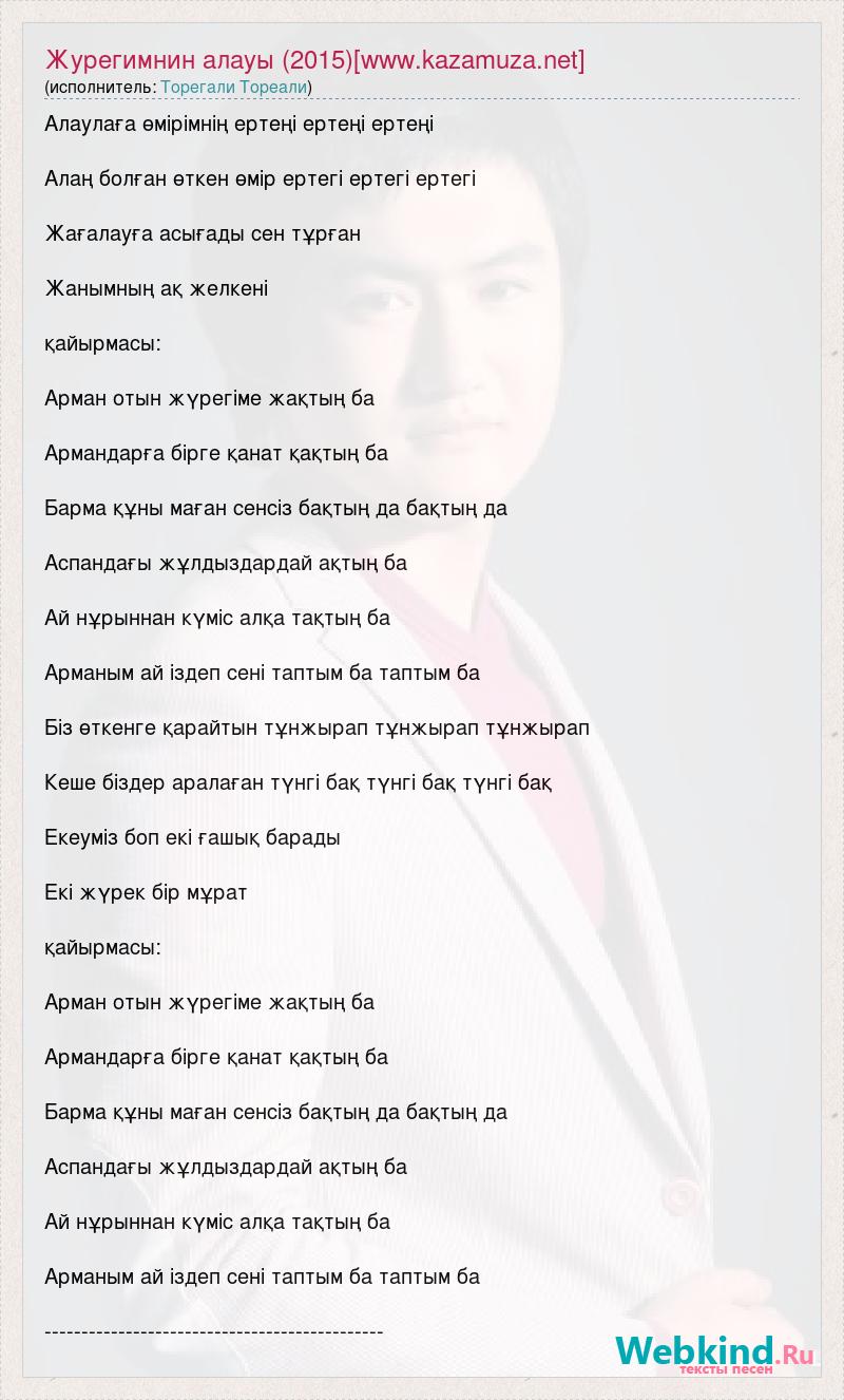 Алаулаға өмірімнің ертеңі ертеңі ертеңі Алаң болған өткен өмір ертегі ертегі ертегі Жағалауға асығады сен тұрған Жанымның ақ желкені қайырмасы: Арман отын жүрегіме жақтың ба Армандарға бірге қанат қақтың ба Барма құны маған сенсіз бақтың да бақтың да Аспандағы жұлдыздардай ақтың ба Ай нұрыннан күміс алқа тақтың ба Арманым ай іздеп сені таптым ба таптым ба Біз өткенге қарайтын тұнжырап тұнжырап тұнжырап Кеше біздер аралаған түнгі бақ түнгі бақ түнгі бақ Екеуміз боп екі ғашық барады Екі жүрек бір мұрат қайырмасы: Арман отын жүрегіме жақтың ба Армандарға бірге қанат қақтың ба Барма құны маған сенсіз бақтың да бақтың да Аспандағы жұлдыздардай ақтың ба Ай нұрыннан күміс алқа тақтың ба Арманым ай іздеп сені таптым ба таптым ба ----------------------------------------------