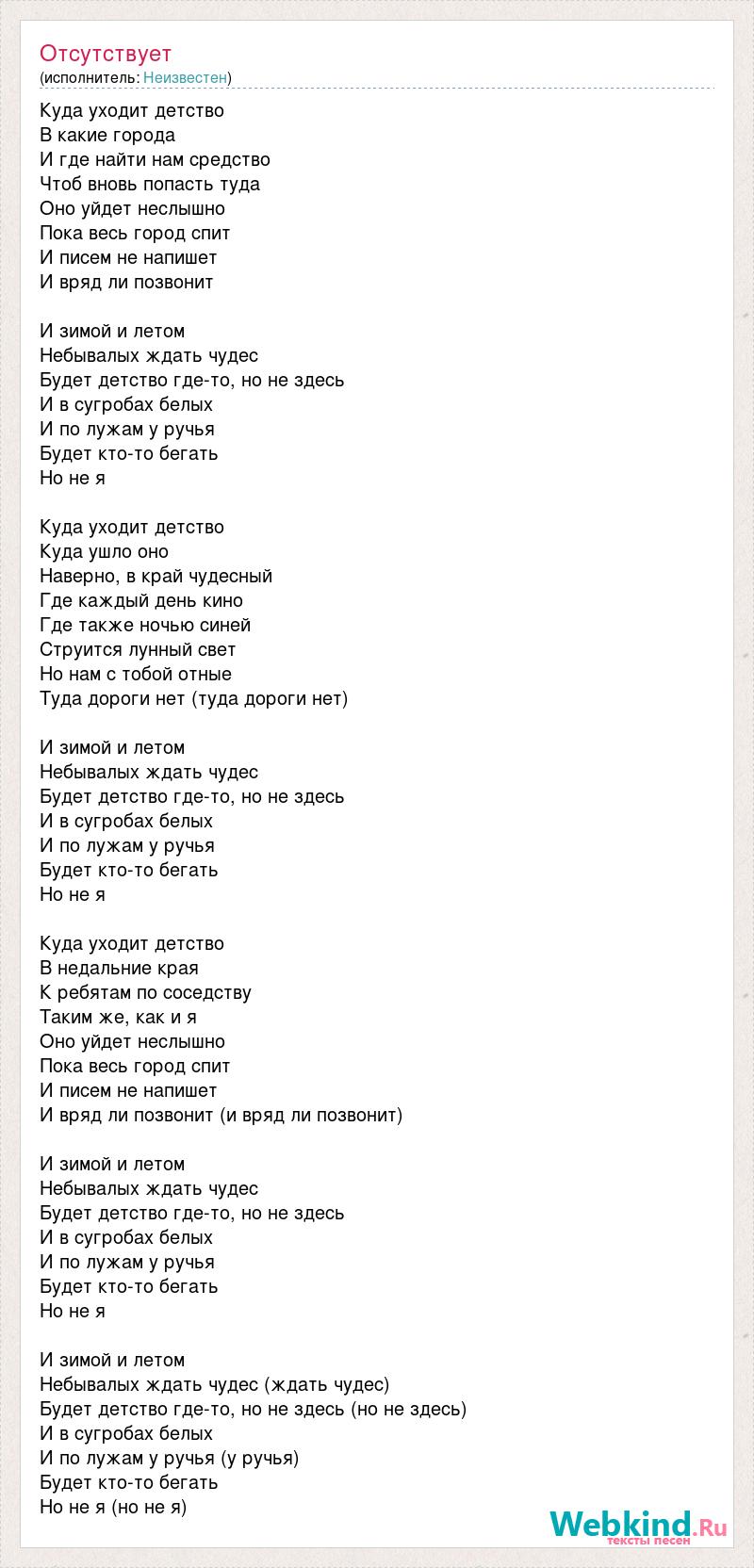 Куда уходит детство В какие города И где найти нам средство Чтоб вновь попасть туда Оно уйдет неслышно Пока весь город спит И писем не напишет И вряд ли позвонит И зимой и летом Небывалых ждать чудес Будет детство где-то, но не здесь И в сугробах белых И по лужам у ручья Будет кто-то бегать Но не я Куда уходит детство Куда ушло оно Наверно, в край чудесный Где каждый день кино Где также ночью синей Струится лунный свет Но нам с тобой отные Туда дороги нет (туда дороги нет) И зимой и летом Небывалых ждать чудес Будет детство где-то, но не здесь И в сугробах белых И по лужам у ручья Будет кто-то бегать Но не я Куда уходит детство В недальние края К ребятам по соседству Таким же, как и я Оно уйдет неслышно Пока весь город спит И писем не напишет И вряд ли позвонит (и вряд ли позвонит) И зимой и летом Небывалых ждать чудес Будет детство где-то, но не здесь И в сугробах белых И по лужам у ручья Будет кто-то бегать Но не я И зимой и летом Небывалых ждать чудес (ждать чудес) Будет детство где-то, но не здесь (но не здесь) И в сугробах белых И по лужам у ручья (у ручья) Будет кто-то бегать Но не я (но не я)