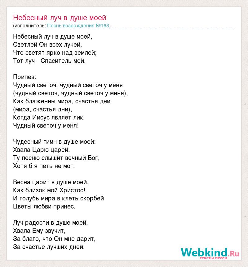 Небесный луч в душе моей, Светлей Он всех лучей, Что светят ярко над землей; Тот луч - Спаситель мой. Припев: Чудный светоч, чудный светоч у меня (чудный светоч, чудный светоч у меня), Как блаженны мира, счастья дни (мира, счастья дни), Когда Иисус являет лик. Чудный светоч у меня! Чудесный гимн в душе моей: Хвала Царю царей. Ту песню слышит вечный Бог, Хотя б я петь не мог. Весна царит в душе моей, Как близок мой Христос! И голубь мира в клеть скорбей Цветы любви принес. Луч радости в душе моей, Хвала Ему звучит, За благо, что Он мне дарит, За счастье лучших дней.