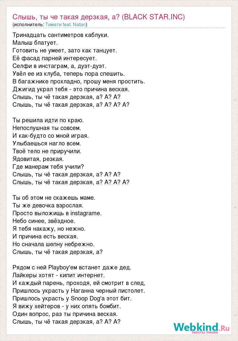 Тринадцать сантиметров каблуки. Малыш блатует. Готовить не умеет, зато как танцует. Её фасад парней интересует. Селфи в инстаграм, а, дуэт-дуэт. Увёл ее из клуба, теперь пора спешить. В багажнике прохладно, прошу меня простить. Джигид украл тебя - это причина веская. Слышь, ты чё такая дерзкая, а? А? А? Слышь, ты чё такая дерзкая, а? А? А? А? Ты решила идти по краю. Непослушная ты совсем. И как-будто со мной играя. Улыбаешься нагло всем. Твоё тело не приручили. Ядовитая, резкая. Где манерам тебя учили? Слышь, ты чё такая дерзкая, а? А? А? Слышь, ты чё такая дерзкая, а? А? А? А? Ты об этом не скажешь маме. Ты же девочка взрослая. Просто выложищь в instagramе. Небо синее, звёздное. Я тебя накажу, но нежно. И причина есть веская. Но сначала шепну небрежно. Слышь, ты чё такая дерзкая, а? Рядом с ней Plаyboy'ем встанет даже дед. Лайкеры хотят - кипит интернет. И каждый парень, проходя, ей смотрит в след, Пришлось украсть у Наганна черный пистолет. Пришлось украсть у Snoop Dog'а этот бит. Я вижу хейтеров - у них опять бомбит. Один вопрос, раз ты причина веская. Слышь, ты чё такая дерзкая, а? А? А?