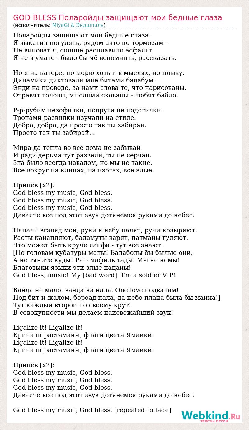 Поларойды защищают мои бедные глаза. Я выкатил погулять, рядом авто по тормозам - Не виноват я, солнце расплавило асфальт, Я не в умате - было бы чё вспомнить, рассказать. Но я на катере, по морю хоть и в мыслях, но плыву. Динамики диктовали мне битами бадабум. Энди на проводе, за нами слова те, что нарисованы. Отравят головы, мыслями скованы - любят бабло. Р-р-рубим незофилки, подруги не подстилки. Тропами развилки изучали на стиле. Добро, добро, да просто так ты забирай. Просто так ты забирай... Мира да тепла во все дома не забывай И ради дерьма тут развели, ты не серчай. Зла было всегда навалом, но мы не такие. Все вокруг на клинах, на изогах, все злые. Припев [х2]: God bless my music, God bless. God bless my music, God bless. God bless my music, God bless. Давайте все под этот звук дотянемся руками до небес. Напали вгзляд мой, руки к небу палят, ручи козыряют. Расты канапляют, баламуты варят, патманы гуляют. Что может быть круче лайфа - тут все знают. [По головам кубатуры малы! Балаболы бы былью они, А не тяните куды! Рагамафиль тады. Мы не немы! Благотыки языки эти злые пацаны! God bless, music! My [bad word] I'm a soldier VIP! Ванда не мало, ванда на нала. One love подвалам! Под бит и жалом, бороад пала, да небо плана была бы манна!] Тут каждый второй по своему крут! В совокупности мы делаем наисвежайший звук! Ligalize it! Ligalize it! - Кричали растаманы, флаги цвета Ямайки! Ligalize it! Ligalize it! - Кричали растаманы, флаги цвета Ямайки! Припев [х2]: God bless my music, God bless. God bless my music, God bless. God bless my music, God bless. Давайте все под этот звук дотянемся руками до небес. God bless my music, God bless. [repeated to fade]