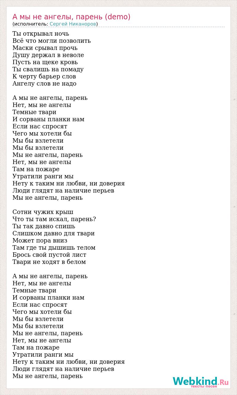 Ты открывал ночь Всё что могли позволить Маски срывал прочь Душу держал в неволе Пусть на щеке кровь Ты свалишь на помаду К черту барьер слов Ангелу слов не надо А мы не ангелы, парень Нет, мы не ангелы Темные твари И сорваны планки нам Если нас спросят Чего мы хотели бы Мы бы взлетели Мы бы взлетели Мы не ангелы, парень Нет, мы не ангелы Там на пожаре Утратили ранги мы Нету к таким ни любви, ни доверия Люди глядят на наличие перьев Мы не ангелы, парень Сотни чужих крыш Что ты там искал, парень? Ты так давно спишь Слишком давно для твари Может пора вниз Там где ты дышишь телом Брось свой пустой лист Твари не ходят в белом А мы не ангелы, парень Нет, мы не ангелы Темные твари И сорваны планки нам Если нас спросят Чего мы хотели бы Мы бы взлетели Мы бы взлетели Мы не ангелы, парень Нет, мы не ангелы Там на пожаре Утратили ранги мы Нету к таким ни любви, ни доверия Люди глядят на наличие перьев Мы не ангелы, парень