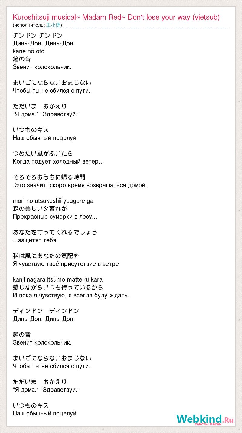 ヂンドン ヂンドン Динь-Дон, Динь-Дон kane no oto 鐘の音 Звенит колокольчик. まいごにならないおまじない Чтобы ты не сбился с пути. ただいま おかえり “Я дома.” “Здравствуй.” いつものキス Наш обычный поцелуй. つめたい風がふいたら Когда подует холодный ветер... そろそろおうちに帰る時間 .Это значит, скоро время возвращаться домой. mori no utsukushii yuugure ga 森の美しい夕暮れが Прекрасные сумерки в лесу... あなたを守ってくれるでしょう ...защитят тебя. 私は風にあなたの気配を Я чувствую твоё присутствие в ветре kanji nagara itsumo matteiru kara 感じながらいつも待っているから И пока я чувствую, я всегда буду ждать. ディンドン ディンドン Динь-Дон, Динь-Дон 鐘の音 Звенит колокольчик. まいごにならないおまじない Чтобы ты не сбился с пути. ただいま おかえり “Я дома.” “Здравствуй.” いつものキス Наш обычный поцелуй.