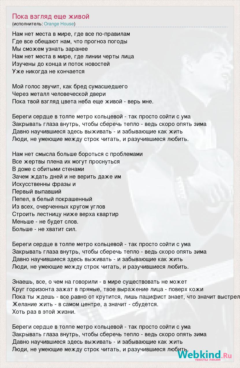 Нам нет места в мире, где все по-правилам Где все обещают нам, что прогноз погоды Мы сможем узнать заранее Нам нет места в мире, где линии черты лица Изучены до конца и поток новостей Уже никогда не кончается Мой голос звучит, как бред сумасшедшего Через металл человеческой двери Пока твой взгляд цвета неба еще живой - верь мне. Береги сердце в толпе метро кольцевой - так просто сойти с ума Закрывать глаза внутрь, чтобы сберечь тепло - ведь скоро опять зима Давно научившиеся здесь выживать - и забывающие как жить Люди, не умеющие между строк читать, и разучившиеся любить. Нам нет смысла больше бороться с проблемами Все жертвы плена их могут проснуться В доме с обитыми стенами Зачем ждать дней и не верить даже им Искусственны фразы и Первый выпавший Пепел, в белый покрашенный Из всех, очерченных кругом углов Строить лестницу ниже верха квартир Меньше - не будет слов. Больше - не хватит сил. Береги сердце в толпе метро кольцевой - так просто сойти с ума Закрывать глаза внутрь, чтобы сберечь тепло - ведь скоро опять зима Давно научившиеся здесь выживать - и забывающие как жить Люди, не умеющие между строк читать, и разучившиеся любить. Знаешь, все, о чем на говорили - в мире существовать не может Круг горизонта зажат в прямые, твое выражение лица - поверх кожи Пока ты ждешь - все равно от крутится, лишь пацифист знает, что значит выстрел Желание жить - в самом центре, а значит - сбудется. Хоть раз в этой жизни. Береги сердце в толпе метро кольцевой - так просто сойти с ума Закрывать глаза внутрь, чтобы сберечь тепло - ведь скоро опять зима Давно научившиеся здесь выживать - и забывающие как жить Люди, не умеющие между строк читать, и разучившиеся любить.