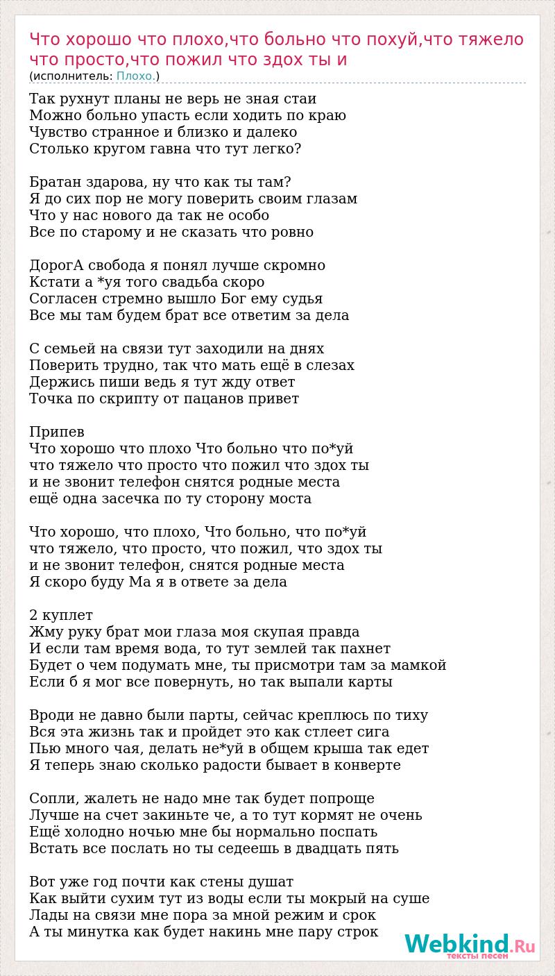 Так рухнут планы не верь не зная стаи Можно больно упасть если ходить по краю Чувство странное и близко и далеко Столько кругом гавна что тут легко? Братан здарова, ну что как ты там? Я до сих пор не могу поверить своим глазам Что у нас нового да так не особо Все по старому и не сказать что ровно ДорогА свобода я понял лучше скромно Кстати а *уя того свадьба скоро Согласен стремно вышло Бог ему судья Все мы там будем брат все ответим за дела С семьей на связи тут заходили на днях Поверить трудно, так что мать ещё в слезах Держись пиши ведь я тут жду ответ Точка по скрипту от пацанов привет Припев Что хорошо что плохо Что больно что по*уй что тяжело что просто что пожил что здох ты и не звонит телефон снятся родные места ещё одна засечка по ту сторону моста Что хорошо, что плохо, Что больно, что по*уй что тяжело, что просто, что пожил, что здох ты и не звонит телефон, снятся родные места Я скоро буду Ма я в ответе за дела 2 куплет Жму руку брат мои глаза моя скупая правда И если там время вода, то тут землей так пахнет Будет о чем подумать мне, ты присмотри там за мамкой Если б я мог все повернуть, но так выпали карты Вроди не давно были парты, сейчас креплюсь по тиху Вся эта жизнь так и пройдет это как стлеет сига Пью много чая, делать не*уй в общем крыша так едет Я теперь знаю сколько радости бывает в конверте Сопли, жалеть не надо мне так будет попроще Лучше на счет закиньте че, а то тут кормят не очень Ещё холодно ночью мне бы нормально поспать Встать все послать но ты седеешь в двадцать пять Вот уже год почти как стены душат Как выйти сухим тут из воды если ты мокрый на суше Лады на связи мне пора за мной режим и срок А ты минутка как будет накинь мне пару строк
