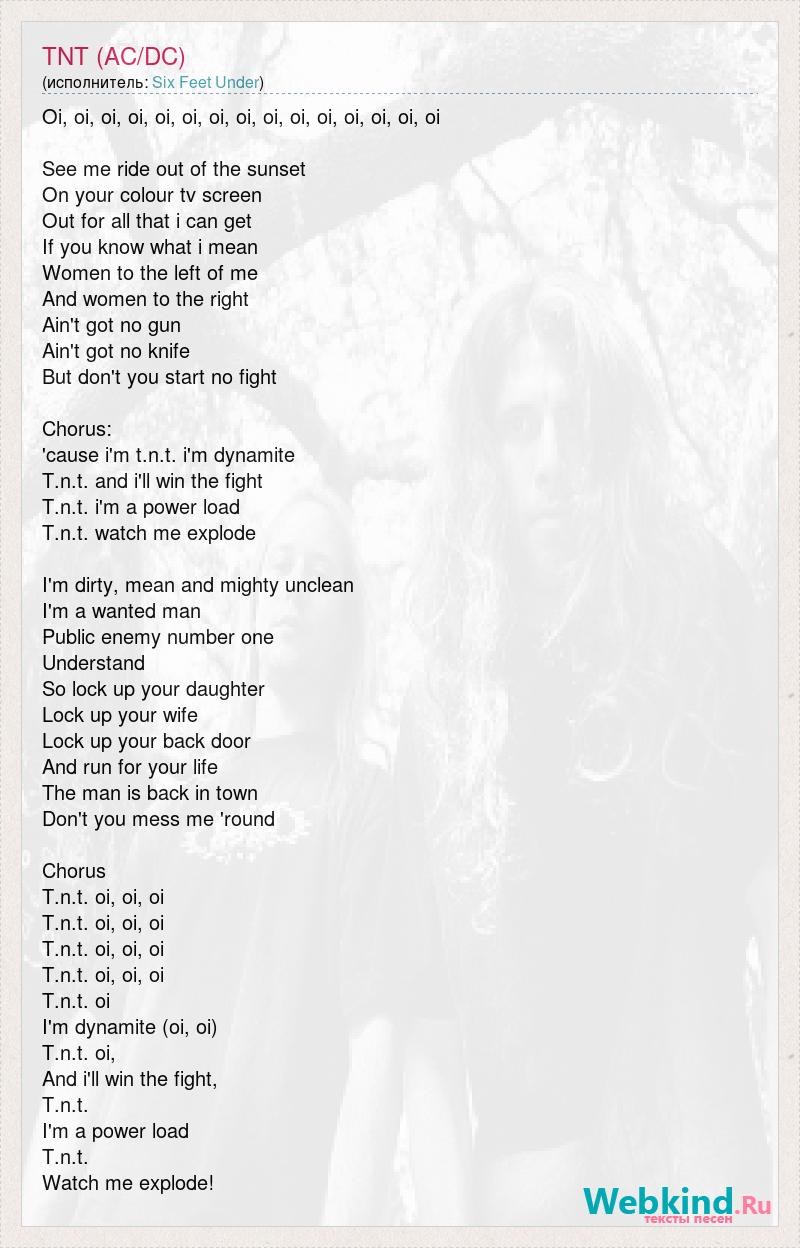 Oi, oi, oi, oi, oi, oi, oi, oi, oi, oi, oi, oi, oi, oi, oi See me ride out of the sunset On your colour tv screen Out for all that i can get If you know what i mean Women to the left of me And women to the right Ain't got no gun Ain't got no knife But don't you start no fight Chorus: 'cause i'm t.n.t. i'm dynamite T.n.t. and i'll win the fight T.n.t. i'm a power load T.n.t. watch me explode I'm dirty, mean and mighty unclean I'm a wanted man Public enemy number one Understand So lock up your daughter Lock up your wife Lock up your back door And run for your life The man is back in town Don't you mess me 'round Chorus T.n.t. oi, oi, oi T.n.t. oi, oi, oi T.n.t. oi, oi, oi T.n.t. oi, oi, oi T.n.t. oi I'm dynamite (oi, oi) T.n.t. oi, And i'll win the fight, T.n.t. I'm a power load T.n.t. Watch me explode!