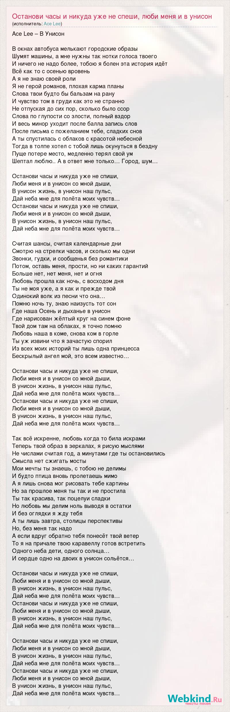 Ace Lee – В Унисон В окнах автобуса мелькают городские образы Шумят машины, а мне нужны так нотки голоса твоего И ничего не надо более, тобою я болен эта история идёт Всё как то с осенью вровень А я не знаю своей роли Я не герой романов, плохая карма планы Слова твои будто бы бальзам на рану И чувство том в груди как это не странно Не отпуская до сих пор, сколько было ссор Слова по глупости со злости, полный вздор И весь минор уходит после балла запись слов После письма с пожеланием тебе, сладких снов А ты спустилась с облаков с красотой небесной Тогда в толпе хотел с тобой лишь окунуться в бездну Пуще потере место, медленно терял свой ум Шептал люблю.. А в ответ мне только… Город, шум… Останови часы и никуда уже не спиши, Люби меня и в унисон со мной дыши, В унисон жизнь, в унисон наш пульс, Дай неба мне для полёта моих чувств… Останови часы и никуда уже не спиши, Люби меня и в унисон со мной дыши, В унисон жизнь, в унисон наш пульс, Дай неба мне для полёта моих чувств… Считая шансы, считая календарные дни Смотрю на стрелки часов, и сколько мы одни Звонки, гудки, и сообщенья без романтики Потом, оставь меня, прости, но ни каких гарантий Больше нет, нет меня, нет и огня Любовь прошла как ночь, с восходом дня Ты не моя уже, а я как и прежде твой Одинокий волк из песни что она… Помню ночь ту, знаю наизусть тот сон Где наша Осень и дыханье в унисон Где нарисован жёлтый круг на синем фоне Твой дом там на облаках, я точно помню Любовь наша в коме, снова ком в горле Ты уж извини что я зачастую спорил Из всех моих историй ты лишь одна принцесса Бескрылый ангел мой, это всем известно… Останови часы и никуда уже не спиши, Люби меня и в унисон со мной дыши, В унисон жизнь, в унисон наш пульс, Дай неба мне для полёта моих чувств… Останови часы и никуда уже не спиши, Люби меня и в унисон со мной дыши, В унисон жизнь, в унисон наш пульс, Дай неба мне для полёта моих чувств… Так всё искренне, любовь когда то била искрами Теперь твой образ в зеркалах, я рисую мыслями Не числами считая год, а минутами где ты остановились Смысла нет сжигать мосты Мои мечты ты знаешь, с тобою не делимы И будто птица вновь пролетаешь мимо А я лишь снова мог рисовать тебе картины Но за прошлое меня ты так и не простила Ты так красива, так поцелуи сладки Но любовь мы делим ноль выводя в остатки И без оглядки я жду тебя А ты лишь завтра, столицы перспективы Но, без меня так надо А если вдруг обратно тебя понесёт твой ветер То я на причале твою каравеллу готов встретить Одного неба дети, одного солнца… И сердце одно на двоих в унисон сольётся… Останови часы и никуда уже не спиши, Люби меня и в унисон со мной дыши, В унисон жизнь, в унисон наш пульс, Дай неба мне для полёта моих чувств… Останови часы и никуда уже не спиши, Люби меня и в унисон со мной дыши, В унисон жизнь, в унисон наш пульс, Дай неба мне для полёта моих чувств… Останови часы и никуда уже не спиши, Люби меня и в унисон со мной дыши, В унисон жизнь, в унисон наш пульс, Дай неба мне для полёта моих чувств… Останови часы и никуда уже не спиши, Люби меня и в унисон со мной дыши, В унисон жизнь, в унисон наш пульс, Дай неба мне для полёта моих чувств…