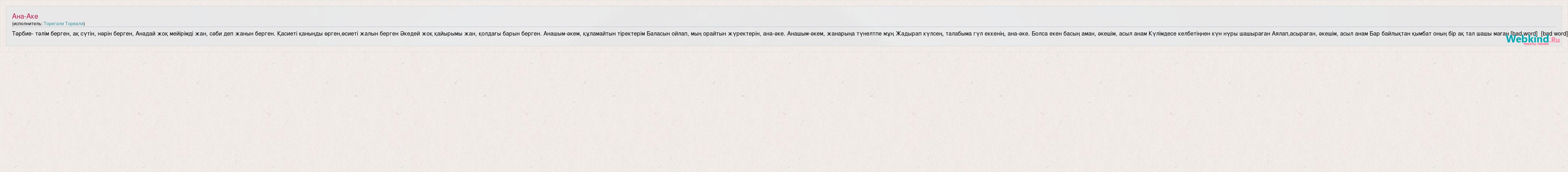 Тәрбие- тәлім берген, ақ сүтін, нәрін берген, Анадай жоқ мейірімді жан, сәби деп жанын берген. Қасиеті қаныңды өрген,өсиеті жалын берген Әкедей жоқ қайырымы жан, қолдағы барын берген. Анашым-әкем, құламайтын тіректерім Баласын ойлап, мың орайтын жүректерін, ана-әке. Анашым-әкем, жанарыңа түнелтпе мұң Жадырап күлсең, талабыма гүл еккенің, ана-әке. Болса екен басың аман, әкешім, асыл анам Күлімдесе келбетіңнен күн нүры шашыраған Аялап,асыраған, әкешім, асыл анам Бар байлықтан қымбат оның бір ақ тал шашы маған [bad word] [bad word]
