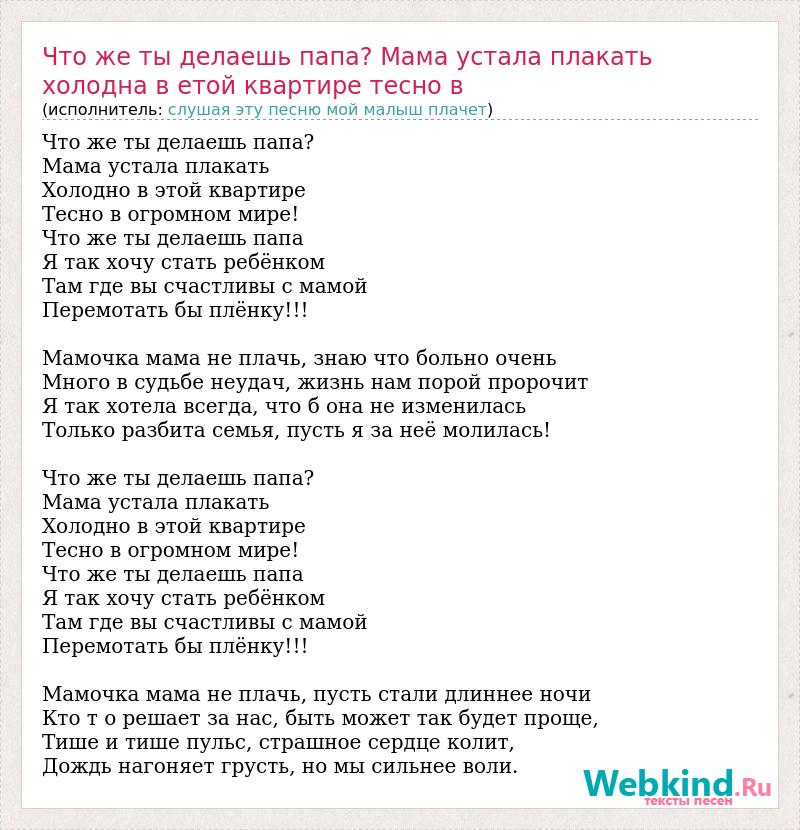 Главная→Исполнители→Слушая эту песню мой малыш плачет→Что же ты делаешь папа? Мама устала плакать холодна в етой квартире тесно в