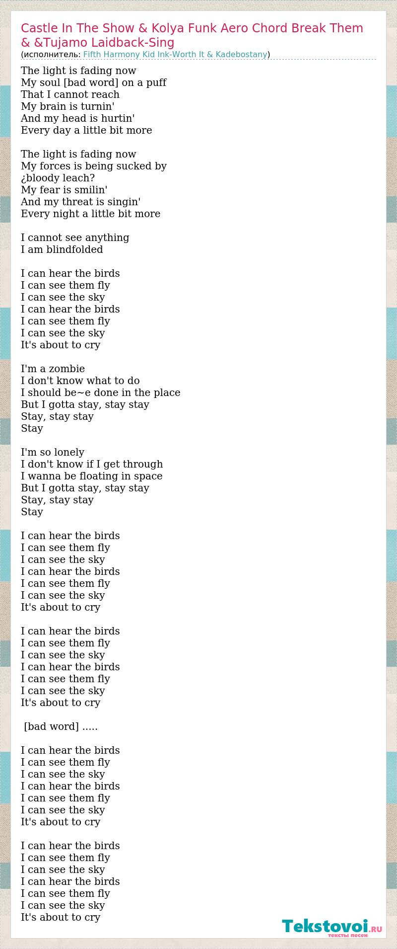 The light is fading now My soul [bad word] on a puff That I cannot reach My brain is turnin' And my head is hurtin' Every day a little bit more The light is fading now My forces is being sucked by ¿bloody leach? My fear is smilin' And my threat is singin' Every night a little bit more I cannot see anything I am blindfolded I can hear the birds I can see them fly I can see the sky I can hear the birds I can see them fly I can see the sky It's about to cry I'm a zombie I don't know what to do I should be~e done in the place But I gotta stay, stay stay Stay, stay stay Stay I'm so lonely I don't know if I get through I wanna be floating in space But I gotta stay, stay stay Stay, stay stay Stay I can hear the birds I can see them fly I can see the sky I can hear the birds I can see them fly I can see the sky It's about to cry I can hear the birds I can see them fly I can see the sky I can hear the birds I can see them fly I can see the sky It's about to cry [bad word] ..... I can hear the birds I can see them fly I can see the sky I can hear the birds I can see them fly I can see the sky It's about to cry I can hear the birds I can see them fly I can see the sky I can hear the birds I can see them fly I can see the sky It's about to cry