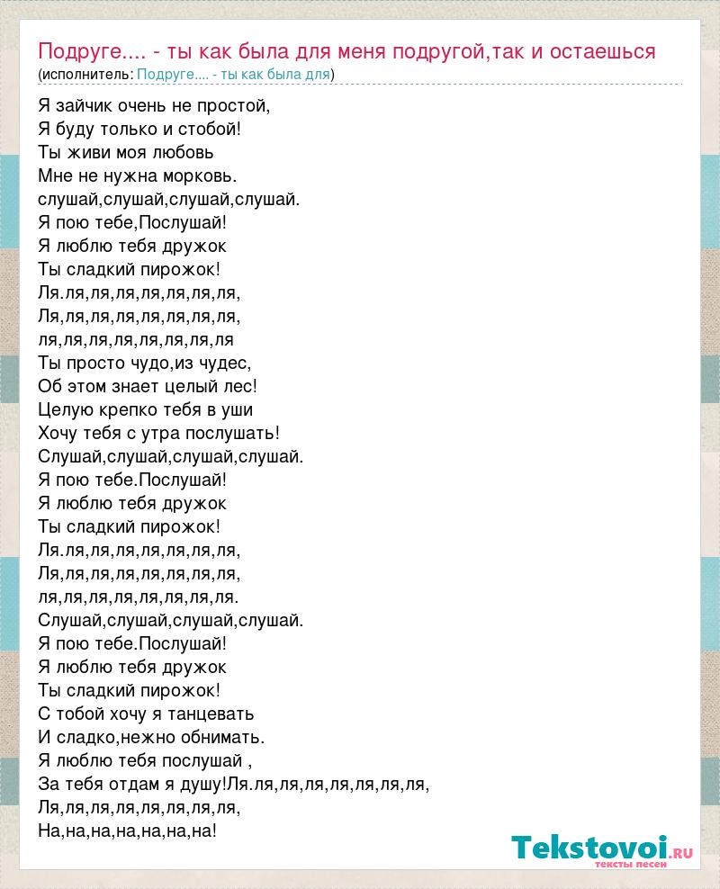 Я зайчик очень не простой, Я буду только и стобой! Ты живи моя любовь Мне не нужна морковь. слушай,слушай,слушай,слушай. Я пою тебе,Послушай! Я люблю тебя дружок Ты сладкий пирожок! Ля.ля,ля,ля,ля,ля,ля,ля, Ля,ля,ля,ля,ля,ля,ля,ля, ля,ля,ля,ля,ля,ля,ля,ля Ты просто чудо,из чудес, Об этом знает целый лес! Целую крепко тебя в уши Хочу тебя с утра послушать! Слушай,слушай,слушай,слушай. Я пою тебе.Послушай! Я люблю тебя дружок Ты сладкий пирожок! Ля.ля,ля,ля,ля,ля,ля,ля, Ля,ля,ля,ля,ля,ля,ля,ля, ля,ля,ля,ля,ля,ля,ля,ля. Слушай,слушай,слушай,слушай. Я пою тебе.Послушай! Я люблю тебя дружок Ты сладкий пирожок! С тобой хочу я танцевать И сладко,нежно обнимать. Я люблю тебя послушай , За тебя отдам я душу!Ля.ля,ля,ля,ля,ля,ля,ля, Ля,ля,ля,ля,ля,ля,ля,ля, На,на,на,на,на,на,на!