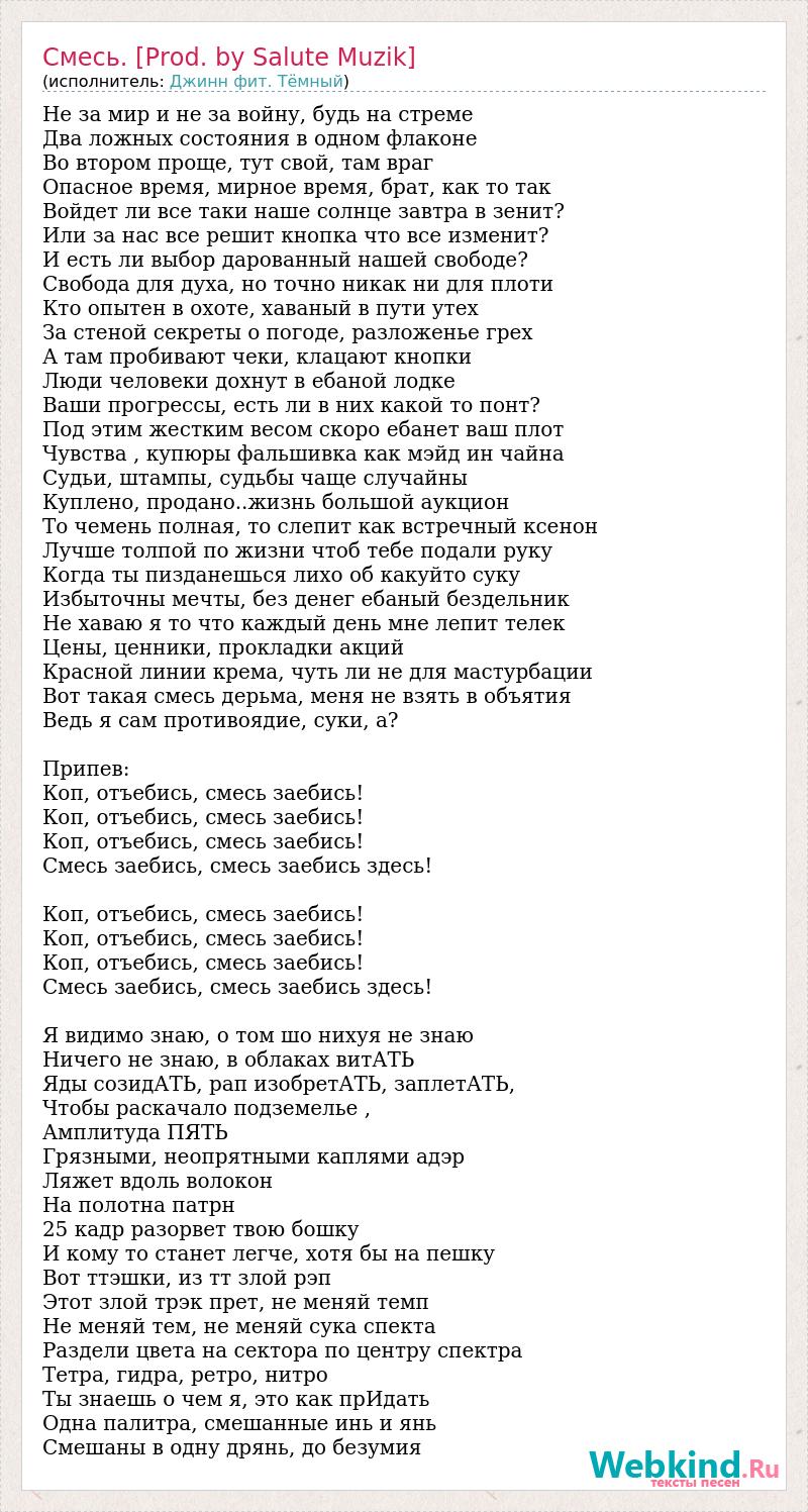 Не за мир и не за войну, будь на стреме Два ложных состояния в одном флаконе Во втором проще, тут свой, там враг Опасное время, мирное время, брат, как то так Войдет ли все таки наше солнце завтра в зенит? Или за нас все решит кнопка что все изменит? И есть ли выбор дарованный нашей свободе? Свобода для духа, но точно никак ни для плоти Кто опытен в охоте, хаваный в пути утех За стеной секреты о погоде, разложенье грех А там пробивают чеки, клацают кнопки Люди человеки дохнут в ебаной лодке Ваши прогрессы, есть ли в них какой то понт? Под этим жестким весом скоро ебанет ваш плот Чувства , купюры фальшивка как мэйд ин чайна Судьи, штампы, судьбы чаще случайны Куплено, продано..жизнь большой аукцион То чемень полная, то слепит как встречный ксенон Лучше толпой по жизни чтоб тебе подали руку Когда ты пизданешься лихо об какуйто суку Избыточны мечты, без денег ебаный бездельник Не хаваю я то что каждый день мне лепит телек Цены, ценники, прокладки акций Красной линии крема, чуть ли не для мастурбации Вот такая смесь дерьма, меня не взять в объятия Ведь я сам противоядие, суки, а? Припев: Коп, отъебись, смесь заебись! Коп, отъебись, смесь заебись! Коп, отъебись, смесь заебись! Смесь заебись, смесь заебись здесь! Коп, отъебись, смесь заебись! Коп, отъебись, смесь заебись! Коп, отъебись, смесь заебись! Смесь заебись, смесь заебись здесь! Я видимо знаю, о том шо нихуя не знаю Ничего не знаю, в облаках витАТЬ Яды созидАТЬ, рап изобретАТЬ, заплетАТЬ, Чтобы раскачало подземелье , Амплитуда ПЯТЬ Грязными, неопрятными каплями адэр Ляжет вдоль волокон На полотна патрн 25 кадр разорвет твою бошку И кому то станет легче, хотя бы на пешку Вот ттэшки, из тт злой рэп Этот злой трэк прет, не меняй темп Не меняй тем, не меняй сука спекта Раздели цвета на сектора по центру спектра Тетра, гидра, ретро, нитро Ты знаешь о чем я, это как прИдать Одна палитра, смешанные инь и янь Смешаны в одну дрянь, до безумия