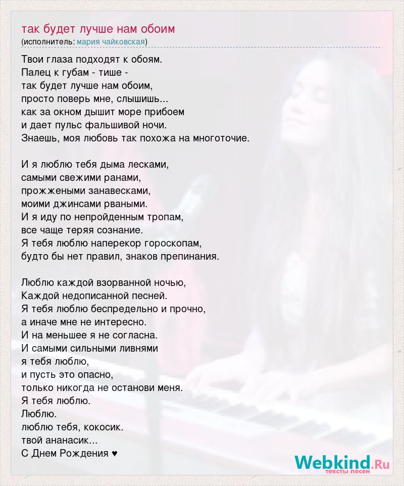 Твои глаза подходят к обоям. Палец к губам - тише - так будет лучше нам обоим, просто поверь мне, слышишь... как за окном дышит море прибоем и дает пульс фальшивой ночи. Знаешь, моя любовь так похожа на многоточие. И я люблю тебя дыма лесками, самыми свежими ранами, прожжеными занавесками, моими джинсами рваными. И я иду по непройденным тропам, все чаще теряя сознание. Я тебя люблю наперекор гороскопам, будто бы нет правил, знаков препинания. Люблю каждой взорванной ночью, Каждой недописанной песней. Я тебя люблю беспредельно и прочно, а иначе мне не интересно. И на меньшее я не согласна. И самыми сильными ливнями я тебя люблю, и пусть это опасно, только никогда не останови меня. Я тебя люблю. Люблю. люблю тебя, кокосик. твой ананасик... С Днем Рождения ♥