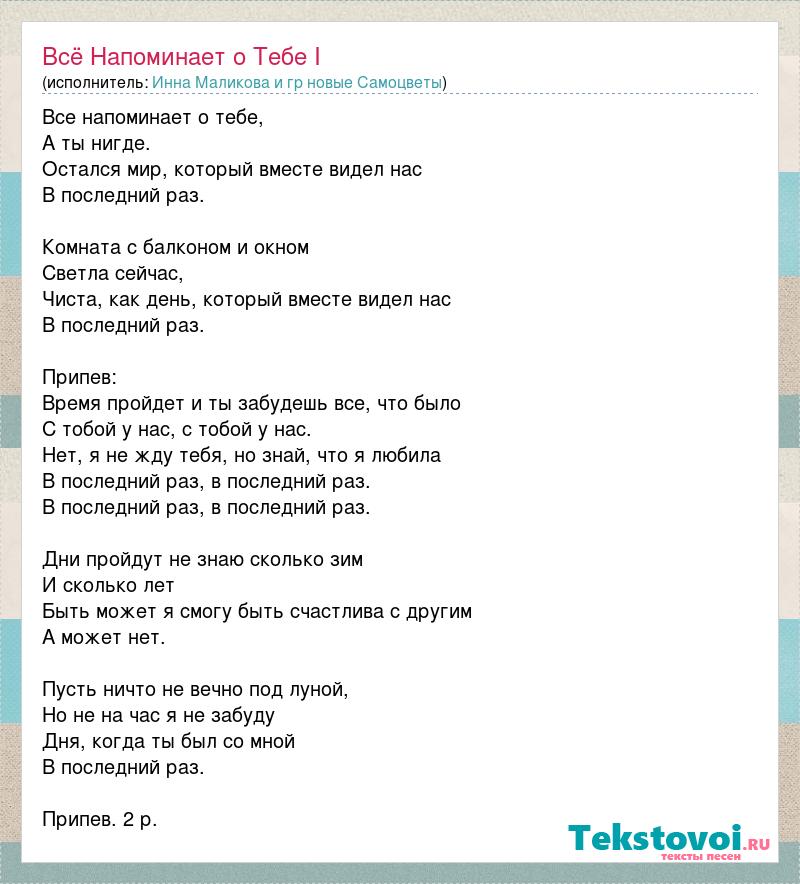 Все напоминает о тебе, А ты нигде. Остался мир, который вместе видел нас В последний раз. Комната с балконом и окном Светла сейчас, Чиста, как день, который вместе видел нас В последний раз. Припев: Время пройдет и ты забудешь все, что было С тобой у нас, с тобой у нас. Нет, я не жду тебя, но знай, что я любила В последний раз, в последний раз. В последний раз, в последний раз. Дни пройдут не знаю сколько зим И сколько лет Быть может я смогу быть счастлива с другим А может нет. Пусть ничто не вечно под луной, Но не на час я не забуду Дня, когда ты был со мной В последний раз. Припев. 2 р.
