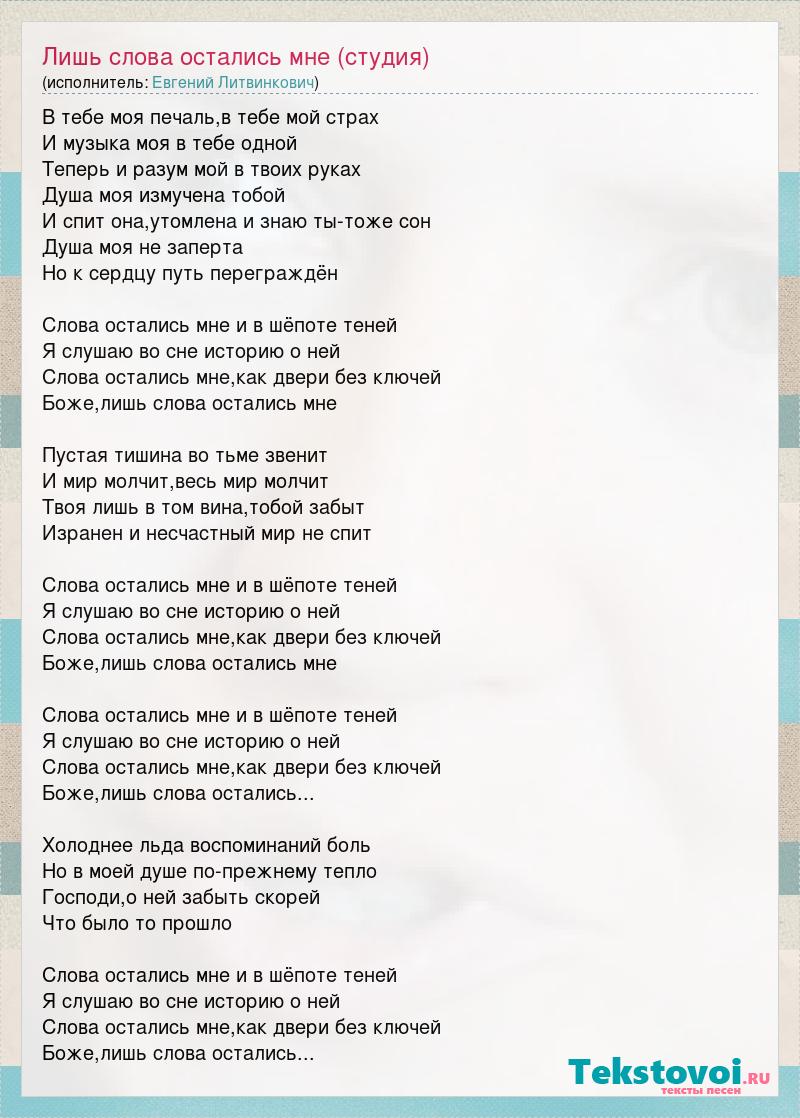 В тебе моя печаль,в тебе мой страх И музыка моя в тебе одной Теперь и разум мой в твоих руках Душа моя измучена тобой И спит она,утомлена и знаю ты-тоже сон Душа моя не заперта Но к сердцу путь переграждён Слова остались мне и в шёпоте теней Я слушаю во сне историю о ней Слова остались мне,как двери без ключей Боже,лишь слова остались мне Пустая тишина во тьме звенит И мир молчит,весь мир молчит Твоя лишь в том вина,тобой забыт Изранен и несчастный мир не спит Слова остались мне и в шёпоте теней Я слушаю во сне историю о ней Слова остались мне,как двери без ключей Боже,лишь слова остались мне Слова остались мне и в шёпоте теней Я слушаю во сне историю о ней Слова остались мне,как двери без ключей Боже,лишь слова остались... Холоднее льда воспоминаний боль Но в моей душе по-прежнему тепло Господи,о ней забыть скорей Что было то прошло Слова остались мне и в шёпоте теней Я слушаю во сне историю о ней Слова остались мне,как двери без ключей Боже,лишь слова остались...