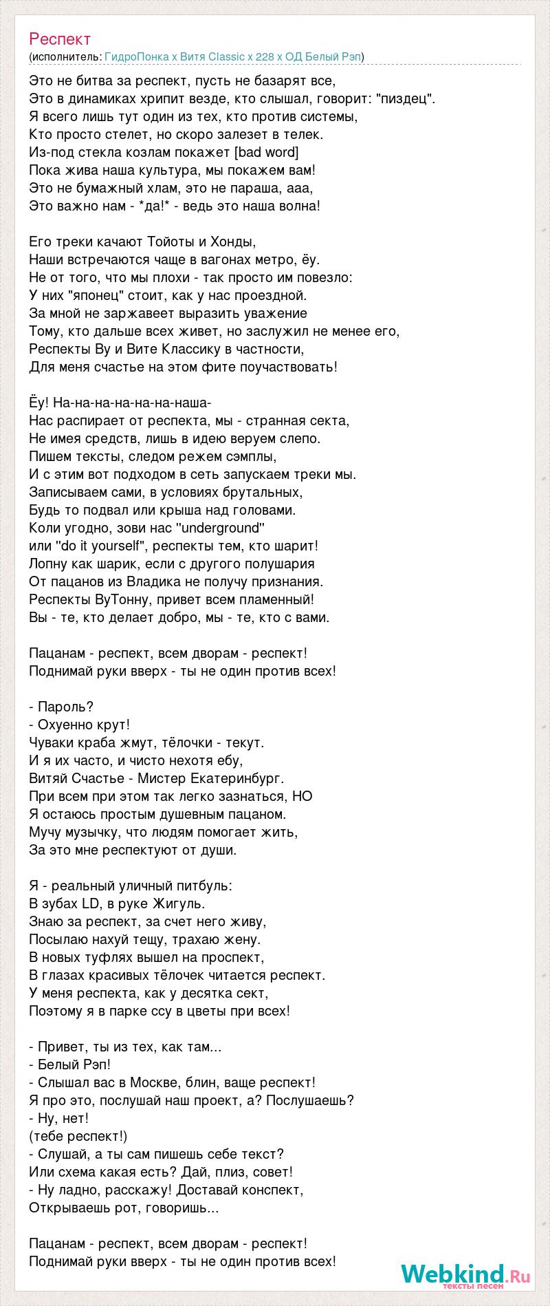 Это не битва за респект, пусть не базарят все, Это в динамиках хрипит везде, кто слышал, говорит: "пиздец". Я всего лишь тут один из тех, кто против системы, Кто просто стелет, но скоро залезет в телек. Из-под стекла козлам покажет [bad word] Пока жива наша культура, мы покажем вам! Это не бумажный хлам, это не параша, ааа, Это важно нам - *да!* - ведь это наша волна! Его треки качают Тойоты и Хонды, Наши встречаются чаще в вагонах метро, ёу. Не от того, что мы плохи - так просто им повезло: У них "японец" стоит, как у нас проездной. За мной не заржавеет выразить уважение Тому, кто дальше всех живет, но заслужил не менее его, Респекты Ву и Вите Классику в частности, Для меня счастье на этом фите поучаствовать! Ёу! На-на-на-на-на-на-наша- Нас распирает от респекта, мы - странная секта, Не имея средств, лишь в идею веруем слепо. Пишем тексты, следом режем сэмплы, И с этим вот подходом в сеть запускаем треки мы. Записываем сами, в условиях брутальных, Будь то подвал или крыша над головами. Коли угодно, зови нас ''underground'' или ''do it yourself", респекты тем, кто шарит! Лопну как шарик, если с другого полушария От пацанов из Владика не получу признания. Респекты ВуТонну, привет всем пламенный! Вы - те, кто делает добро, мы - те, кто с вами. Пацанам - респект, всем дворам - респект! Поднимай руки вверх - ты не один против всех! - Пароль? - Охуенно крут! Чуваки краба жмут, тёлочки - текут. И я их часто, и чисто нехотя ебу, Витяй Счастье - Мистер Екатеринбург. При всем при этом так легко зазнаться, НО Я остаюсь простым душевным пацаном. Мучу музычку, что людям помогает жить, За это мне респектуют от души. Я - реальный уличный питбуль: В зубах LD, в руке Жигуль. Знаю за респект, за счет него живу, Посылаю нахуй тещу, трахаю жену. В новых туфлях вышел на проспект, В глазах красивых тёлочек читается респект. У меня респекта, как у десятка сект, Поэтому я в парке ссу в цветы при всех! - Привет, ты из тех, как там... - Белый Рэп! - Слышал вас в Москве, блин, ваще респект! Я про это, послушай наш проект, а? Послушаешь? - Ну, нет! (тебе респект!) - Слушай, а ты сам пишешь себе текст? Или схема какая есть? Дай, плиз, совет! - Ну ладно, расскажу! Доставай конспект, Открываешь рот, говоришь... Пацанам - респект, всем дворам - респект! Поднимай руки вверх - ты не один против всех!