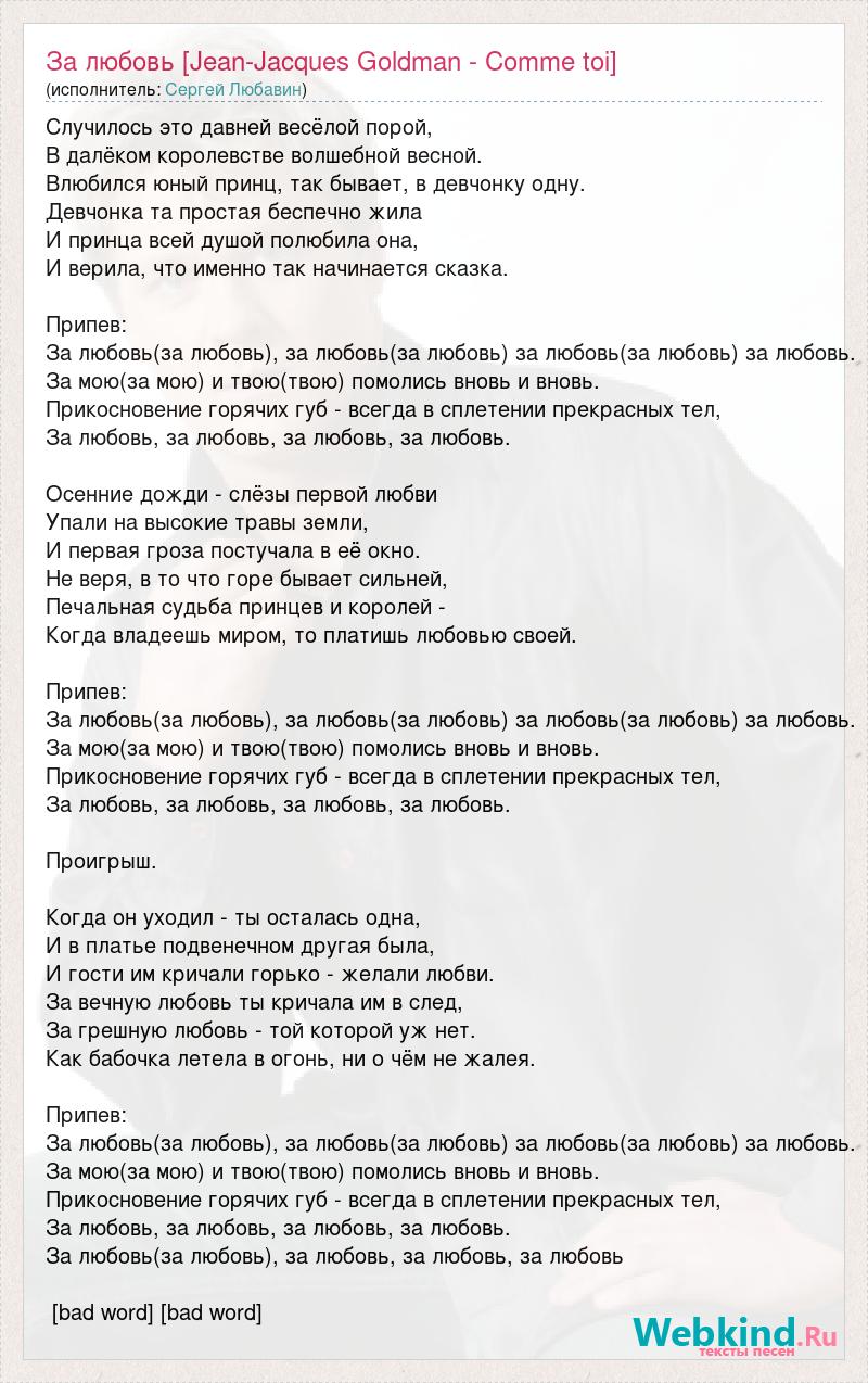 Случилось это давней весёлой порой, В далёком королевстве волшебной весной. Влюбился юный принц, так бывает, в девчонку одну. Девчонка та простая беспечно жила И принца всей душой полюбила она, И верила, что именно так начинается сказка. Припев: За любовь(за любовь), за любовь(за любовь) за любовь(за любовь) за любовь. За мою(за мою) и твою(твою) помолись вновь и вновь. Прикосновение горячих губ - всегда в сплетении прекрасных тел, За любовь, за любовь, за любовь, за любовь. Осенние дожди - слёзы первой любви Упали на высокие травы земли, И первая гроза постучала в её окно. Не веря, в то что горе бывает сильней, Печальная судьба принцев и королей - Когда владеешь миром, то платишь любовью своей. Припев: За любовь(за любовь), за любовь(за любовь) за любовь(за любовь) за любовь. За мою(за мою) и твою(твою) помолись вновь и вновь. Прикосновение горячих губ - всегда в сплетении прекрасных тел, За любовь, за любовь, за любовь, за любовь. Проигрыш. Когда он уходил - ты осталась одна, И в платье подвенечном другая была, И гости им кричали горько - желали любви. За вечную любовь ты кричала им в след, За грешную любовь - той которой уж нет. Как бабочка летела в огонь, ни о чём не жалея. Припев: За любовь(за любовь), за любовь(за любовь) за любовь(за любовь) за любовь. За мою(за мою) и твою(твою) помолись вновь и вновь. Прикосновение горячих губ - всегда в сплетении прекрасных тел, За любовь, за любовь, за любовь, за любовь. За любовь(за любовь), за любовь, за любовь, за любовь [bad word] [bad word]