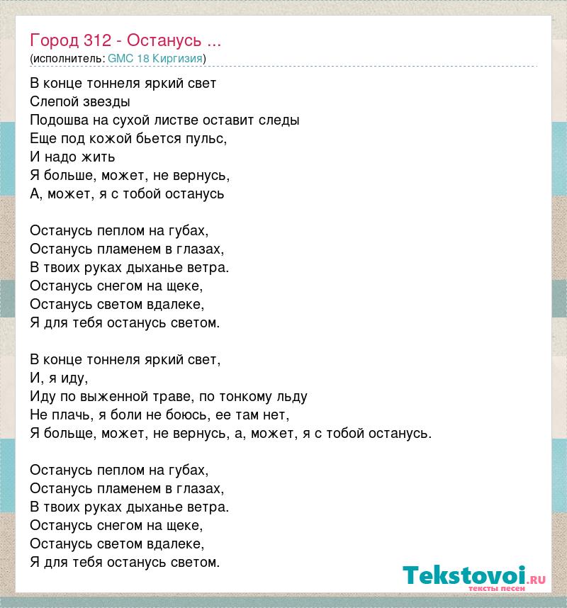 В конце тоннеля яркий свет Слепой звезды Подошва на сухой листве оставит следы Еще под кожой бьется пульс, И надо жить Я больше, может, не вернусь, А, может, я с тобой останусь Останусь пеплом на губах, Останусь пламенем в глазах, В твоих руках дыханье ветра. Останусь снегом на щеке, Останусь светом вдалеке, Я для тебя останусь светом. В конце тоннеля яркий свет, И, я иду, Иду по выженной траве, по тонкому льду Не плачь, я боли не боюсь, ее там нет, Я больще, может, не вернусь, а, может, я с тобой останусь. Останусь пеплом на губах, Останусь пламенем в глазах, В твоих руках дыханье ветра. Останусь снегом на щеке, Останусь светом вдалеке, Я для тебя останусь светом.