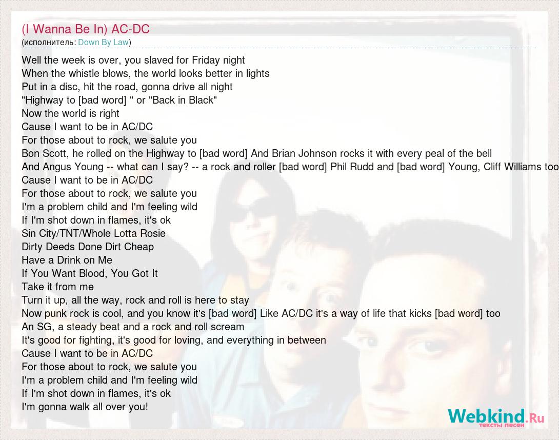 Well the week is over, you slaved for Friday night When the whistle blows, the world looks better in lights Put in a disc, hit the road, gonna drive all night "Highway to [bad word] " or "Back in Black" Now the world is right Cause I want to be in AC/DC For those about to rock, we salute you Bon Scott, he rolled on the Highway to [bad word] And Brian Johnson rocks it with every peal of the bell And Angus Young -- what can I say? -- a rock and roller [bad word] Phil Rudd and [bad word] Young, Cliff Williams too Cause I want to be in AC/DC For those about to rock, we salute you I'm a problem child and I'm feeling wild If I'm shot down in flames, it's ok Sin City/TNT/Whole Lotta Rosie Dirty Deeds Done Dirt Cheap Have a Drink on Me If You Want Blood, You Got It Take it from me Turn it up, all the way, rock and roll is here to stay Now punk rock is cool, and you know it's [bad word] Like AC/DC it's a way of life that kicks [bad word] too An SG, a steady beat and a rock and roll scream It's good for fighting, it's good for loving, and everything in between Cause I want to be in AC/DC For those about to rock, we salute you I'm a problem child and I'm feeling wild If I'm shot down in flames, it's ok I'm gonna walk all over you!