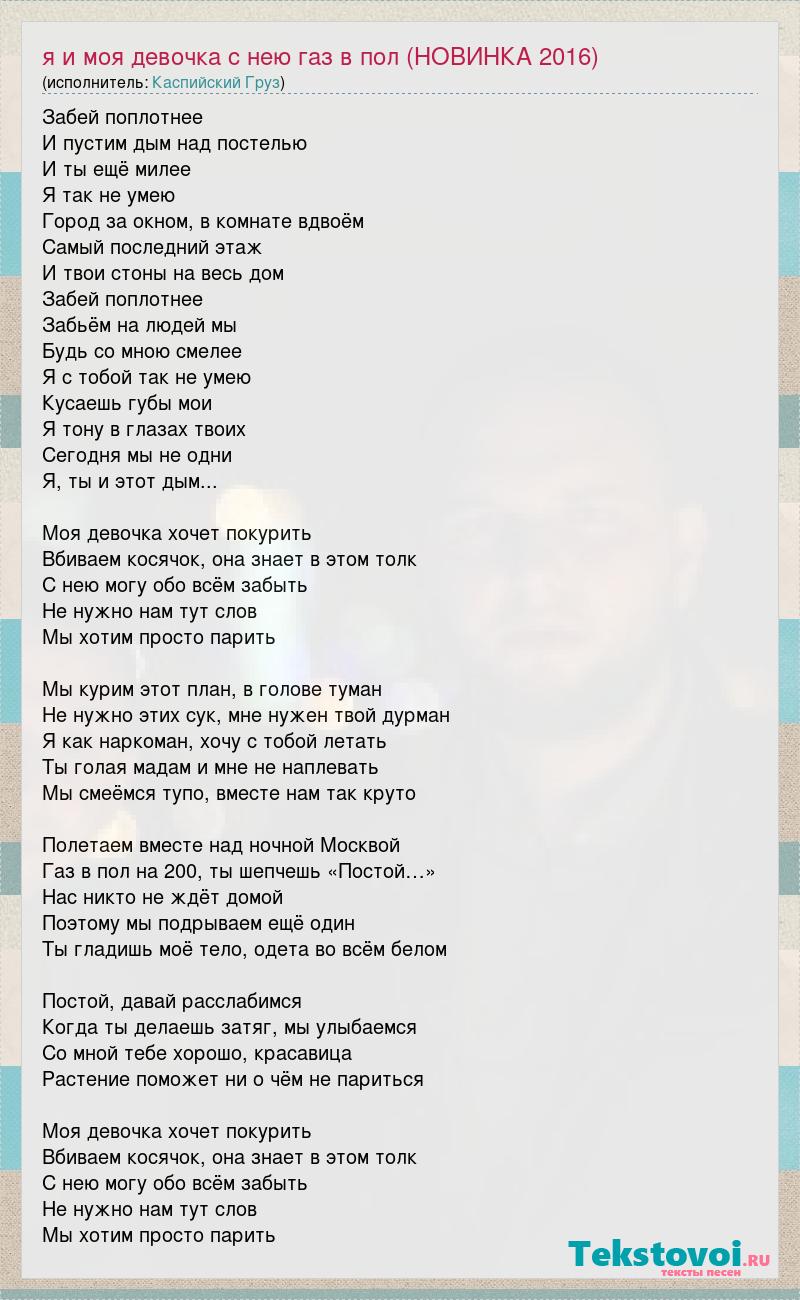 Забей поплотнее И пустим дым над постелью И ты ещё милее Я так не умею Город за окном, в комнате вдвоём Самый последний этаж И твои стоны на весь дом Забей поплотнее Забьём на людей мы Будь со мною смелее Я с тобой так не умею Кусаешь губы мои Я тону в глазах твоих Сегодня мы не одни Я, ты и этот дым... Моя девочка хочет покурить Вбиваем косячок, она знает в этом толк С нею могу обо всём забыть Не нужно нам тут слов Мы хотим просто парить Мы курим этот план, в голове туман Не нужно этих сук, мне нужен твой дурман Я как наркоман, хочу с тобой летать Ты голая мадам и мне не наплевать Мы смеёмся тупо, вместе нам так круто Полетаем вместе над ночной Москвой Газ в пол на 200, ты шепчешь «Постой…» Нас никто не ждёт домой Поэтому мы подрываем ещё один Ты гладишь моё тело, одета во всём белом Постой, давай расслабимся Когда ты делаешь затяг, мы улыбаемся Со мной тебе хорошо, красавица Растение поможет ни о чём не париться Моя девочка хочет покурить Вбиваем косячок, она знает в этом толк С нею могу обо всём забыть Не нужно нам тут слов Мы хотим просто парить