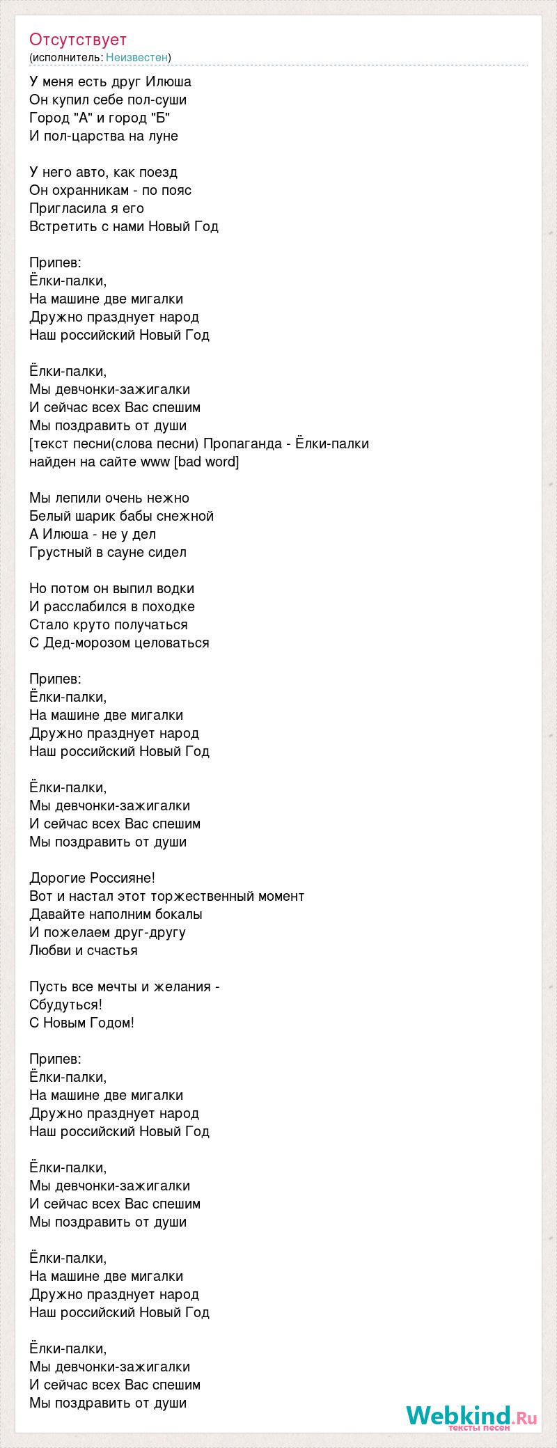 У меня есть друг Илюша Он купил себе пол-суши Город "А" и город "Б" И пол-царства на луне У него авто, как поезд Он охранникам - по пояс Пригласила я его Встретить с нами Новый Год Припев: Ёлки-палки, На машине две мигалки Дружно празднует народ Наш российский Новый Год Ёлки-палки, Мы девчонки-зажигалки И сейчас всех Вас спешим Мы поздравить от души [текст песни(слова песни) Пропаганда - Ёлки-палки найден на сайте www [bad word] Мы лепили очень нежно Белый шарик бабы снежной А Илюша - не у дел Грустный в сауне сидел Но потом он выпил водки И расслабился в походке Стало круто получаться С Дед-морозом целоваться Припев: Ёлки-палки, На машине две мигалки Дружно празднует народ Наш российский Новый Год Ёлки-палки, Мы девчонки-зажигалки И сейчас всех Вас спешим Мы поздравить от души Дорогие Россияне! Вот и настал этот торжественный момент Давайте наполним бокалы И пожелаем друг-другу Любви и счастья Пусть все мечты и желания - Сбудуться! С Новым Годом! Припев: Ёлки-палки, На машине две мигалки Дружно празднует народ Наш российский Новый Год Ёлки-палки, Мы девчонки-зажигалки И сейчас всех Вас спешим Мы поздравить от души Ёлки-палки, На машине две мигалки Дружно празднует народ Наш российский Новый Год Ёлки-палки, Мы девчонки-зажигалки И сейчас всех Вас спешим Мы поздравить от души