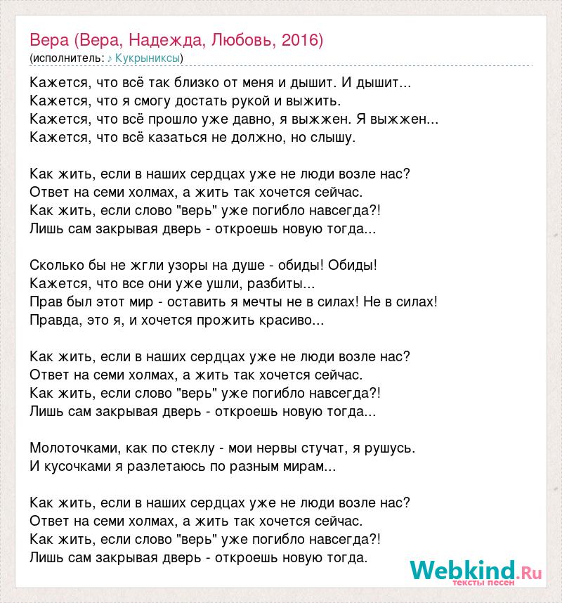 Кажется, что всё так близко от меня и дышит. И дышит... Кажется, что я смогу достать рукой и выжить. Кажется, что всё прошло уже давно, я выжжен. Я выжжен... Кажется, что всё казаться не должно, но слышу. Как жить, если в наших сердцах уже не люди возле нас? Ответ на семи холмах, а жить так хочется сейчас. Как жить, если слово "верь" уже погибло навсегда?! Лишь сам закрывая дверь - откроешь новую тогда... Сколько бы не жгли узоры на душе - обиды! Обиды! Кажется, что все они уже ушли, разбиты... Прав был этот мир - оставить я мечты не в силах! Не в силах! Правда, это я, и хочется прожить красиво... Как жить, если в наших сердцах уже не люди возле нас? Ответ на семи холмах, а жить так хочется сейчас. Как жить, если слово "верь" уже погибло навсегда?! Лишь сам закрывая дверь - откроешь новую тогда... Молоточками, как по стеклу - мои нервы стучат, я рушусь. И кусочками я разлетаюсь по разным мирам... Как жить, если в наших сердцах уже не люди возле нас? Ответ на семи холмах, а жить так хочется сейчас. Как жить, если слово "верь" уже погибло навсегда?! Лишь сам закрывая дверь - откроешь новую тогда.