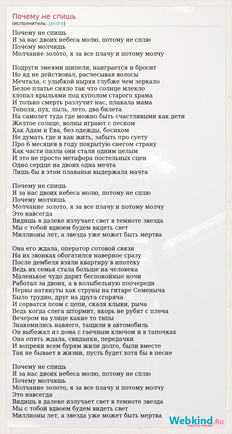 Почему не спишь Я за нас двоих небеса молю, потому не сплю Почему молчишь Молчание золото, я за все плачу и потому молчу Подруги змеями шипели, наиграется и бросит Но яд не действовал, расчесывая волосы Мечтала, с улыбкой ныряя глубже чем зеркало Белое платье сияло так что солнце млекло хлопал крыльями под куполом старого храма И только смерть разлучит нас, плакала мама Тополя, пух, пыль, лето, два билета На самолет туда где можно быть счастливыми как дети Желтое солнце, волны играют с песком Как Адам и Ева, без одежды, босиком Не думать где и как жить, забыть про суету Про 6 месяцев в году покрытую снегом страну Как части пазла они стали одним целым И это не просто метафора постельных сцен Одно сердце на двоих одна мечта Лишь бы в этом плаваньи выдержала мачта Почему не спишь Я за нас двоих небеса молю, потому не сплю Почему молчишь Молчание золото, я за все плачу и потому молчу Это навсегда Видишь в далеке излучает свет в темноте звезда Мы с тобой вдвоем будем видеть свет Миллионы лет, а звезда уже может быть мертва Она его ждала, оператор сотовой связи На их звонках обогатился наверное сразу После дембеля взяли квартиру в ипотеку Ведь их семья стала больше на человека Маленькое чудо дарит беспокойные ночи Работал за двоих, а в колыбельную поочереди Нервы натянуты как струны на гитаре Семеныча Было трудно, друг на друга сгоряча И сорватся псом с цепи, скаля клыки, рыча Ведь когда слега штормит, якорь не рубят с плеча Вечером на улице какие то типы Знакомились навяего, тащили в автомобиль Он выбежал из дома с гаечным ключом и в тапочках Она опять ждала, свиданки, передачки И вопреки всем бурям жили долго, были вместе Так не бывает в жизни, пусть будет хотя бы в песне Почему не спишь Я за нас двоих небеса молю, потому не сплю Почему молчишь Молчание золото, я за все плачу и потому молчу Это навсегда Видишь в далеке излучает свет в темноте звезда Мы с тобой вдвоем будем видеть свет Миллионы лет, а звезда уже может быть мертва