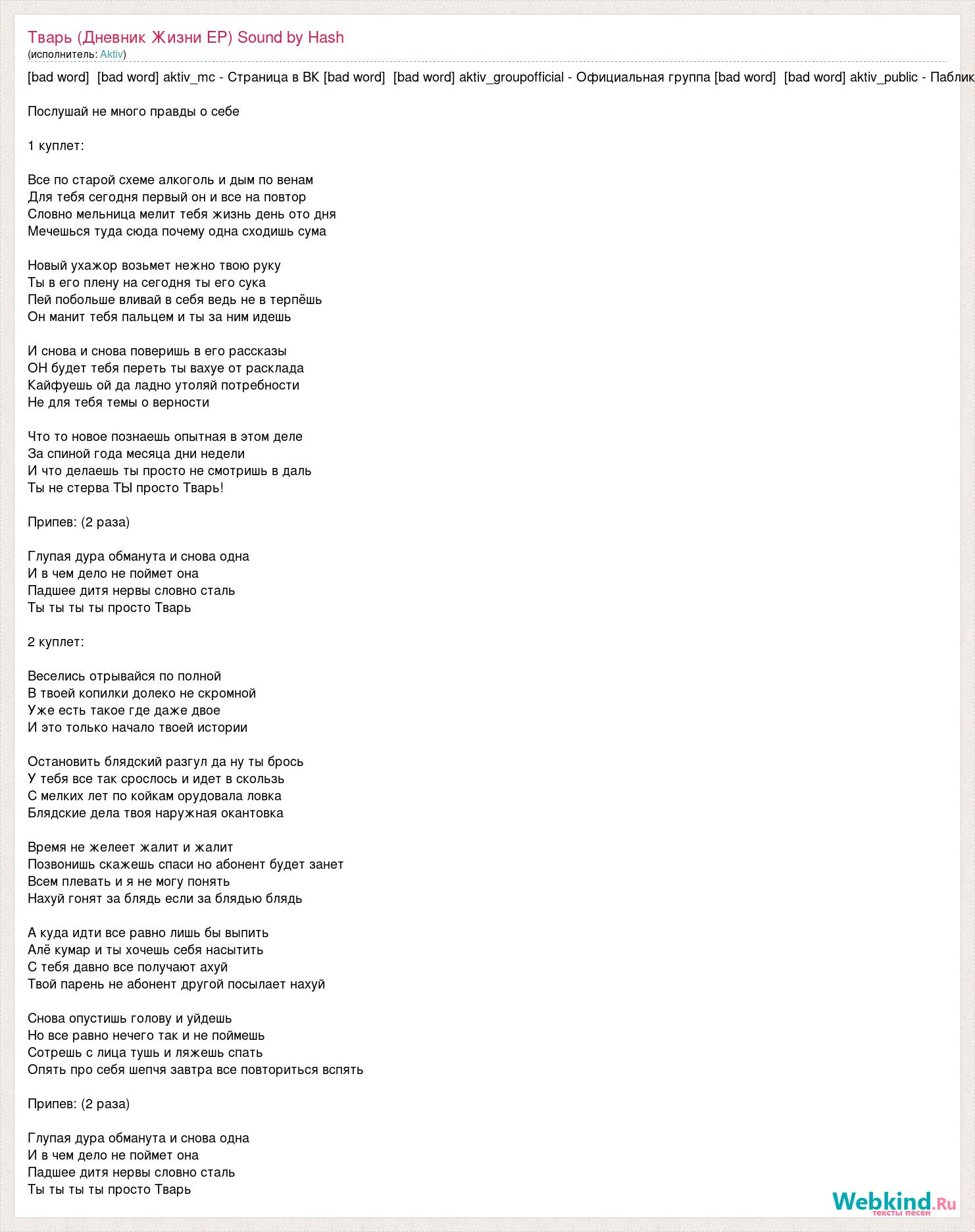 [bad word] [bad word] aktiv_mc - Страница в ВК [bad word] [bad word] aktiv_groupofficial - Официальная группа [bad word] [bad word] aktiv_public - Паблик Послушай не много правды о себе 1 куплет: Все по старой схеме алкоголь и дым по венам Для тебя сегодня первый он и все на повтор Словно мельница мелит тебя жизнь день ото дня Мечешься туда сюда почему одна сходишь сума Новый ухажор возьмет нежно твою руку Ты в его плену на сегодня ты его сука Пей побольше вливай в себя ведь не в терпёшь Он манит тебя пальцем и ты за ним идешь И снова и снова поверишь в его рассказы ОН будет тебя переть ты вахуе от расклада Кайфуешь ой да ладно утоляй потребности Не для тебя темы о верности Что то новое познаешь опытная в этом деле За спиной года месяца дни недели И что делаешь ты просто не смотришь в даль Ты не стерва ТЫ просто Тварь! Припев: (2 раза) Глупая дура обманута и снова одна И в чем дело не поймет она Падшее дитя нервы словно сталь Ты ты ты ты просто Тварь 2 куплет: Веселись отрывайся по полной В твоей копилки долеко не скромной Уже есть такое где даже двое И это только начало твоей истории Остановить блядский разгул да ну ты брось У тебя все так срослось и идет в скользь С мелких лет по койкам орудовала ловка Блядские дела твоя наружная окантовка Время не желеет жалит и жалит Позвонишь скажешь спаси но абонент будет занет Всем плевать и я не могу понять Нахуй гонят за блядь если за блядью блядь А куда идти все равно лишь бы выпить Алё кумар и ты хочешь себя насытить С тебя давно все получают ахуй Твой парень не абонент другой посылает нахуй Снова опустишь голову и уйдешь Но все равно нечего так и не поймешь Сотрешь с лица тушь и ляжешь спать Опять про себя шепчя завтра все повториться вспять Припев: (2 раза) Глупая дура обманута и снова одна И в чем дело не поймет она Падшее дитя нервы словно сталь Ты ты ты ты просто Тварь