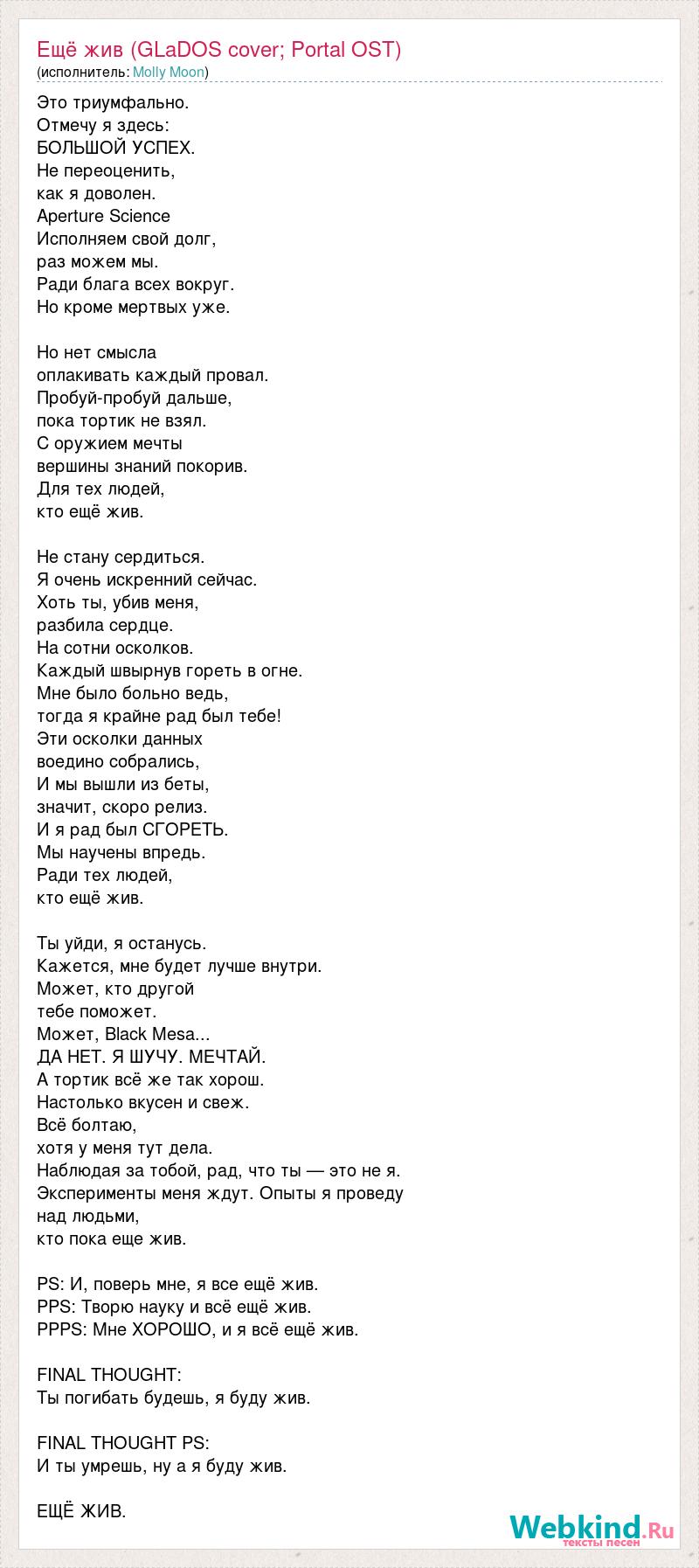 Это триумфально. Отмечу я здесь: БОЛЬШОЙ УСПЕХ. Не переоценить, как я доволен. Aperture Science Исполняем свой долг, раз можем мы. Ради блага всех вокруг. Но кроме мертвых уже. Но нет смысла оплакивать каждый провал. Пробуй-пробуй дальше, пока тортик не взял. С оружием мечты вершины знаний покорив. Для тех людей, кто ещё жив. Не стану сердиться. Я очень искренний сейчас. Хоть ты, убив меня, разбила сердце. На сотни осколков. Каждый швырнув гореть в огне. Мне было больно ведь, тогда я крайне рад был тебе! Эти осколки данных воедино собрались, И мы вышли из беты, значит, скоро релиз. И я рад был СГОРЕТЬ. Мы научены впредь. Ради тех людей, кто ещё жив. Ты уйди, я останусь. Кажется, мне будет лучше внутри. Может, кто другой тебе поможет. Может, Black Mesa... ДА НЕТ. Я ШУЧУ. МЕЧТАЙ. А тортик всё же так хорош. Настолько вкусен и свеж. Всё болтаю, хотя у меня тут дела. Наблюдая за тобой, рад, что ты — это не я. Эксперименты меня ждут. Опыты я проведу над людьми, кто пока еще жив. PS: И, поверь мне, я все ещё жив. PPS: Творю науку и всё ещё жив. PPPS: Мне ХОРОШО, и я всё ещё жив. FINAL THOUGHT: Ты погибать будешь, я буду жив. FINAL THOUGHT PS: И ты умрешь, ну а я буду жив. ЕЩЁ ЖИВ.