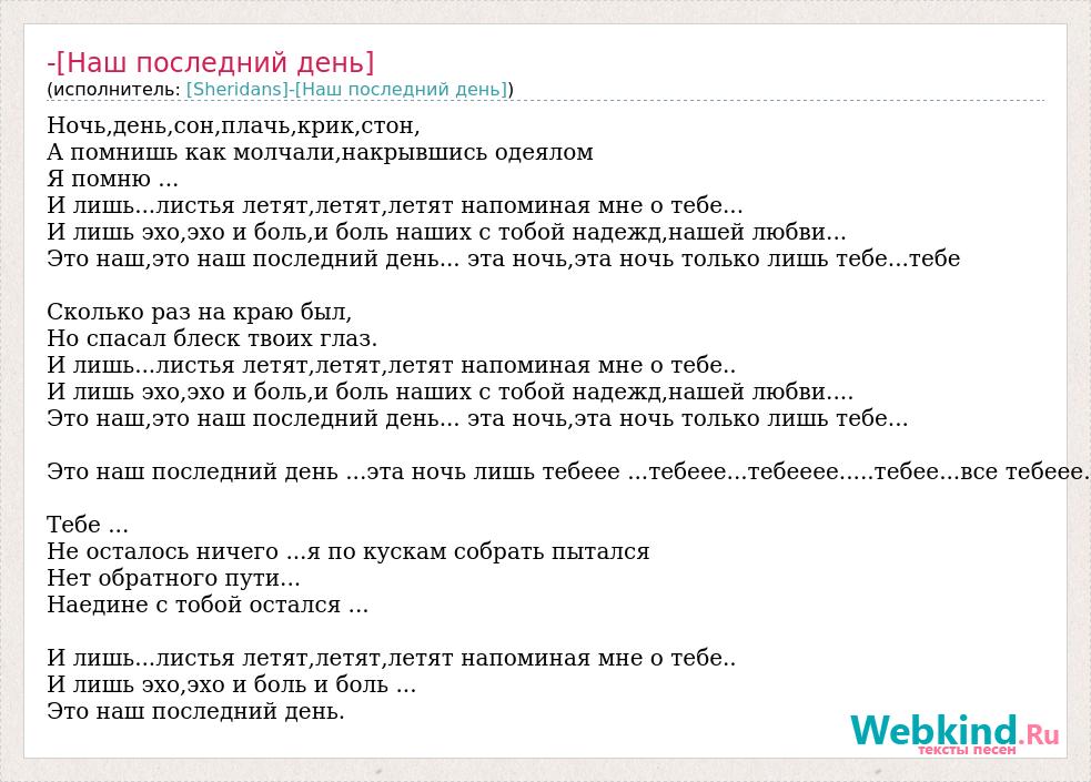 Ночь,день,сон,плачь,крик,стон, А помнишь как молчали,накрывшись одеялом Я помню ... И лишь...листья летят,летят,летят напоминая мне о тебе... И лишь эхо,эхо и боль,и боль наших с тобой надежд,нашей любви... Это наш,это наш последний день... эта ночь,эта ночь только лишь тебе...тебе Сколько раз на краю был, Но спасал блеск твоих глаз. И лишь...листья летят,летят,летят напоминая мне о тебе.. И лишь эхо,эхо и боль,и боль наших с тобой надежд,нашей любви.... Это наш,это наш последний день... эта ночь,эта ночь только лишь тебе... Это наш последний день ...эта ночь лишь тебеее ...тебеее...тебееее.....тебее...все тебеее. Тебе ... Не осталось ничего ...я по кускам собрать пытался Нет обратного пути... Наедине с тобой остался ... И лишь...листья летят,летят,летят напоминая мне о тебе.. И лишь эхо,эхо и боль и боль ... Это наш последний день.